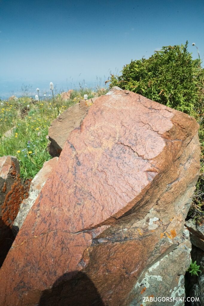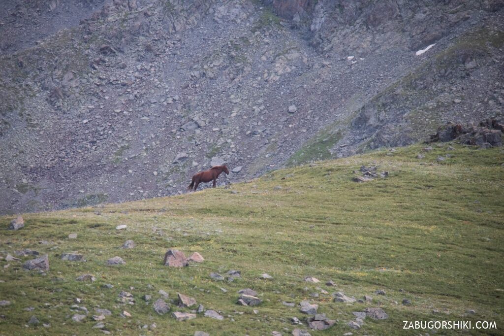 Мы дошли до горы Рахат и начали спуск к перевалу Кыземшек. Там нас встретили снег, пасущиеся кони и наскальные рисунки бронзового века – атмосфера стала по-настоящему альпийской. Проще говоря, вот они – настоящие Альпы.