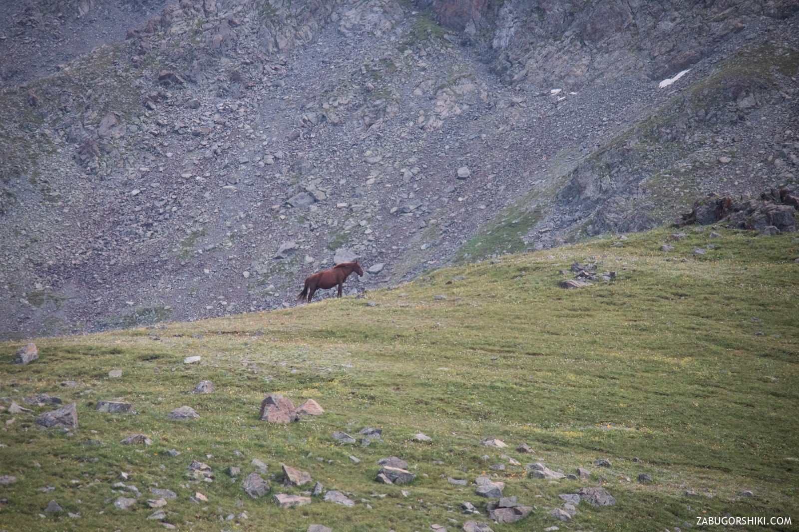 Мы дошли до горы Рахат и начали спуск к перевалу Кыземшек. Там нас встретили снег, пасущиеся кони и наскальные рисунки бронзового века – атмосфера стала по-настоящему альпийской. Проще говоря, вот они – настоящие Альпы.