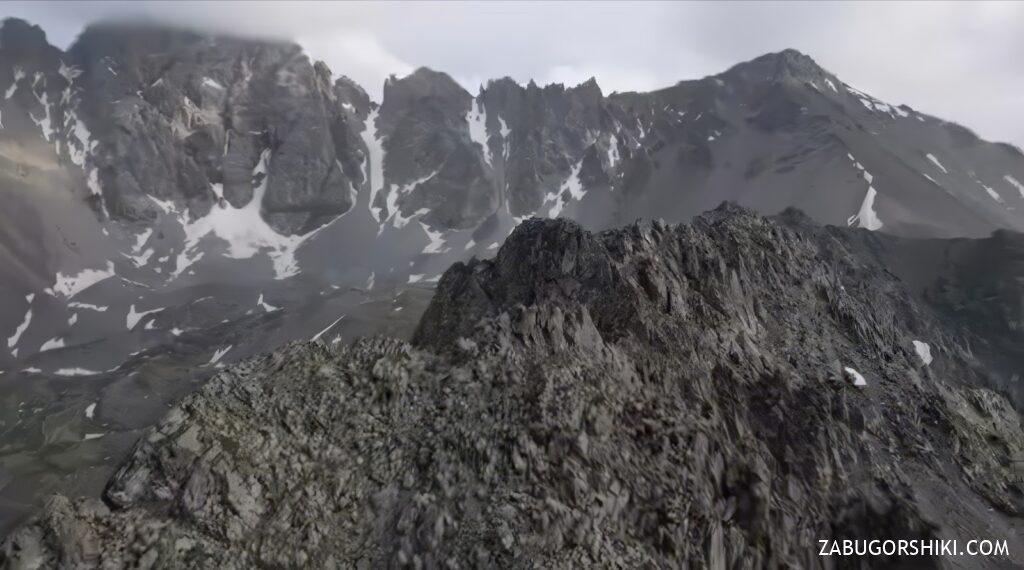 На перевале Ренат сказал, что время поджимает и ему нужно спускаться вниз. Мы планировали позвать его в однодневный тур по долине, но по таймингу не успевали. Запустили дрон, попрощались, пожелали ему удачи – и ушли траверсом на гору. Высота около 3040 метров. Нам предстоял спуск в долину цирка Иссык-Баш.