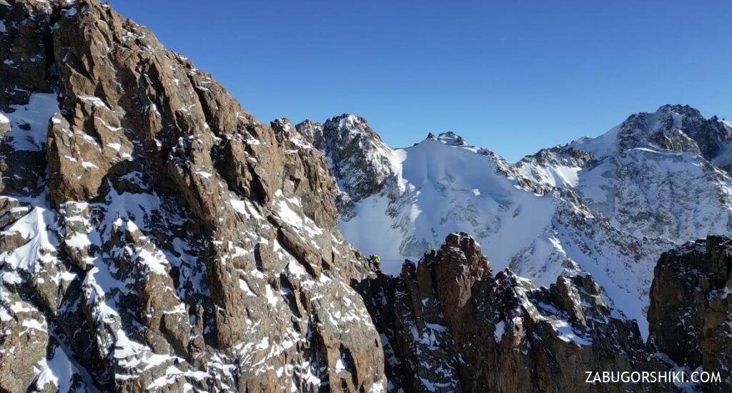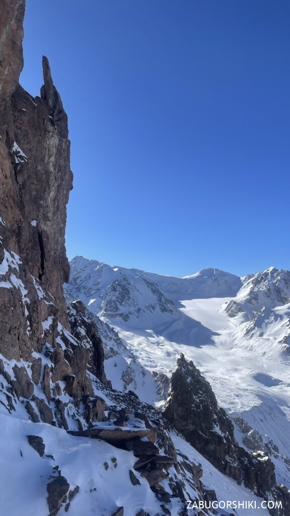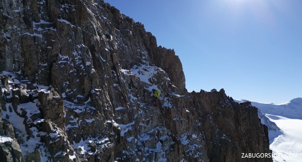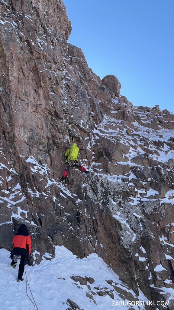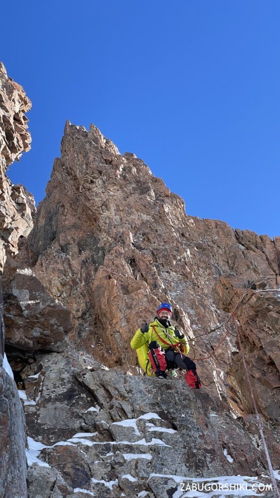 Время не ждет, и нам предстоял спуск. Мы быстро начали движение вниз, проработали участок гребня, установили веревки и выполнили дюльфер. Техническая часть маршрута была пройдена!