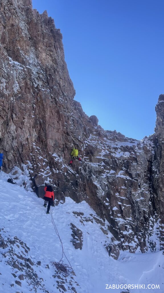 Подъем на Альпинград (стоянки альпинистов на высоте 3400 метров) занял около часа. Оказавшись в холодном кулуаре под началом маршрута 2А, мы были полностью сосредоточены на предстоящей технической части. Никто из нас не думал о комфорте домашнего дивана — только о преодолении предстоящих препятствий.