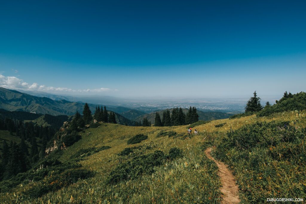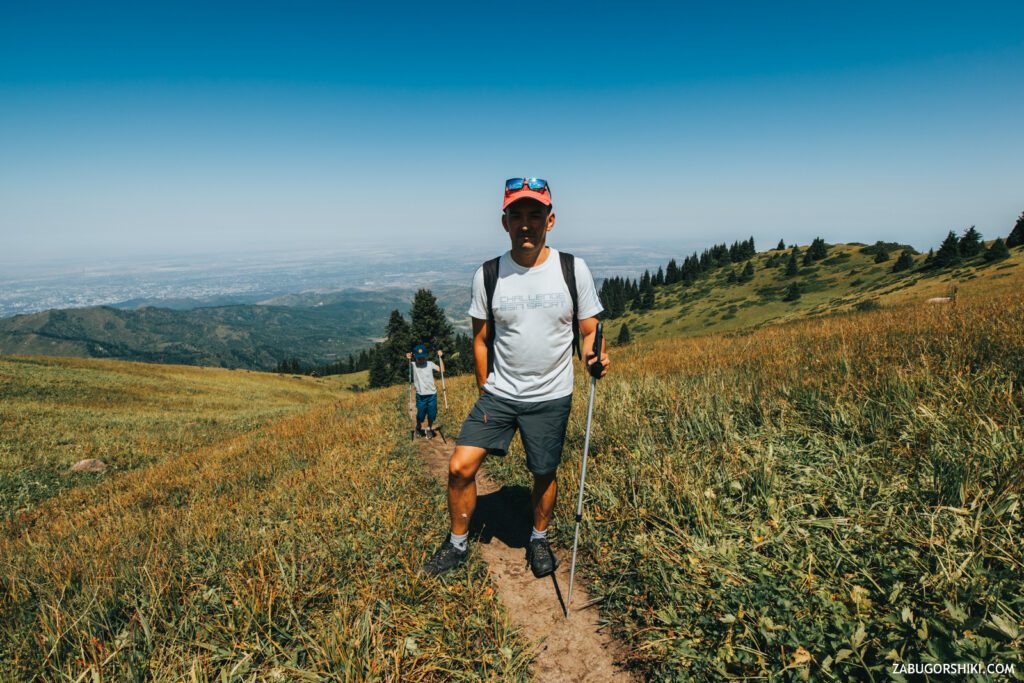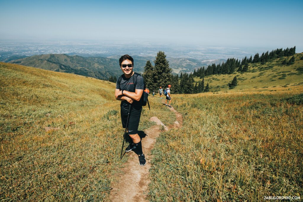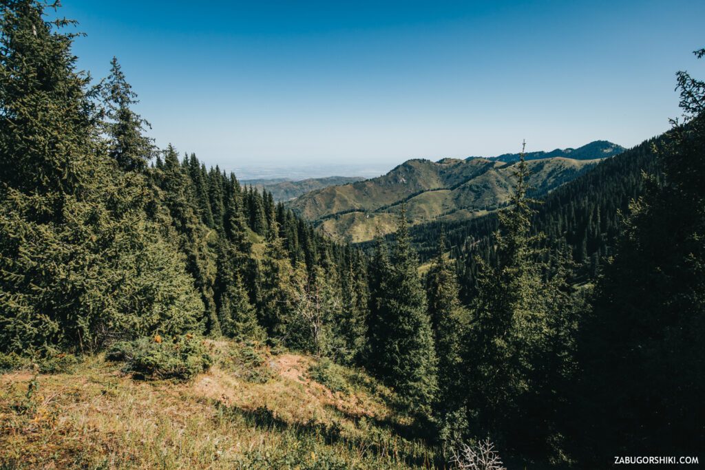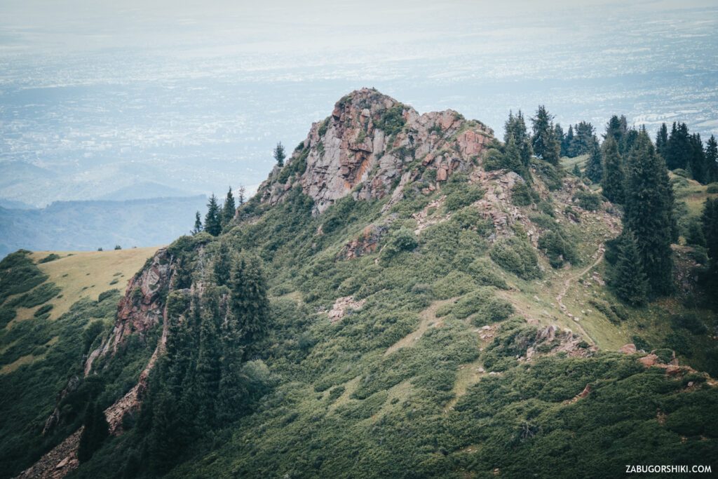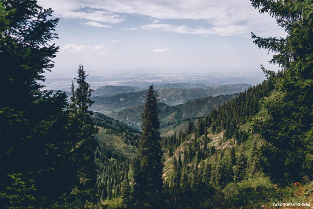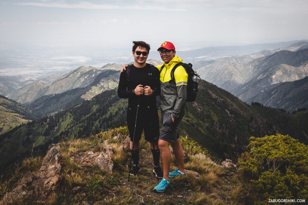 Прошли 8.8 км , набрали по высоте 1000 м. Лес резко обрывается и мы выходим на плато «мыс Надежды», с которой уже виднеется пик Нурсултан (бывш.Комсомол), пик Панорама, Кок-Жайляу, «город тысячи красок» и НАША ЦЕЛЬ!!!