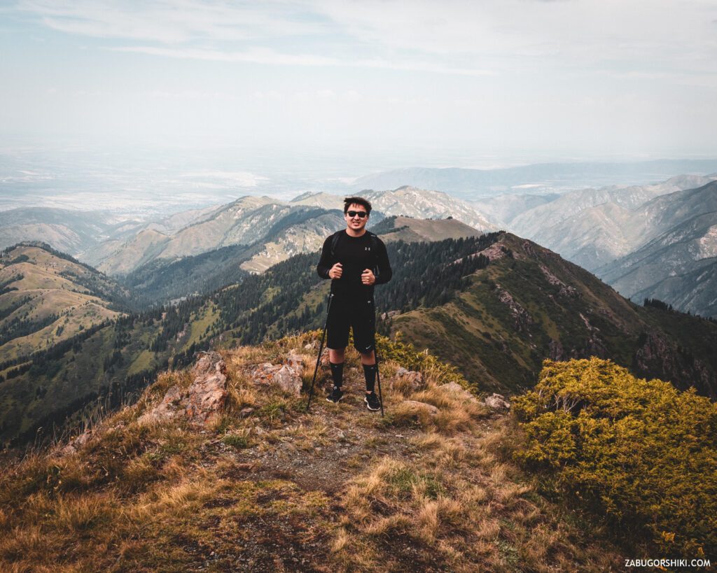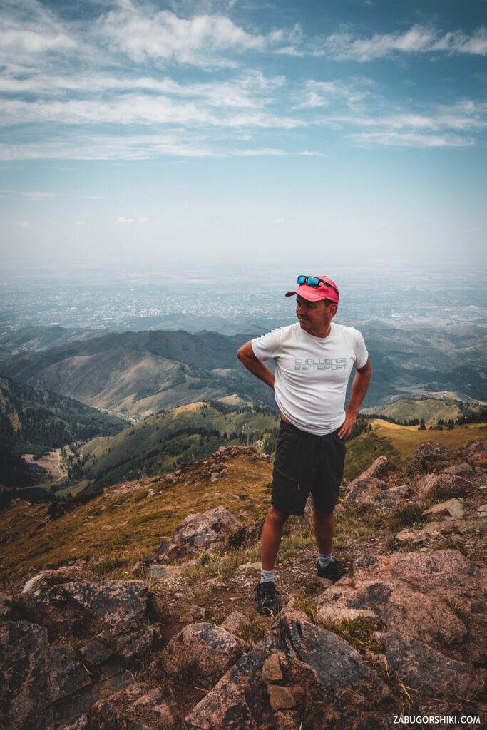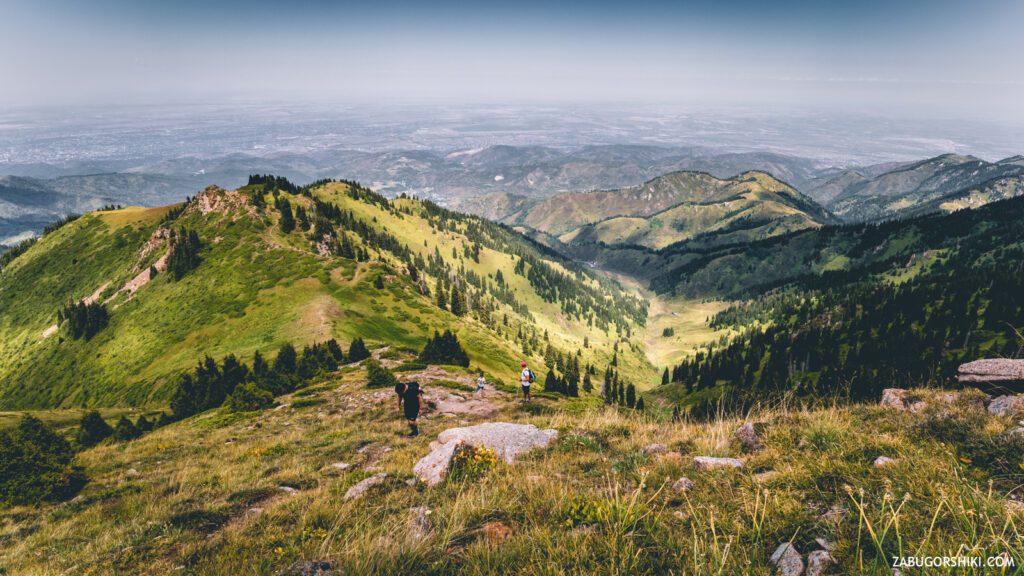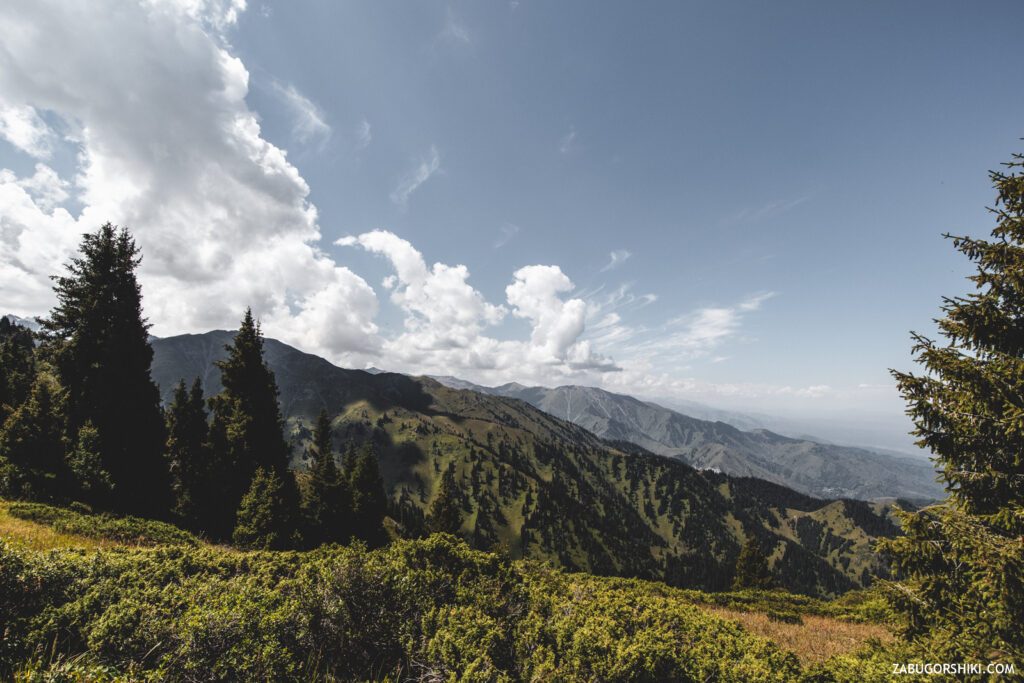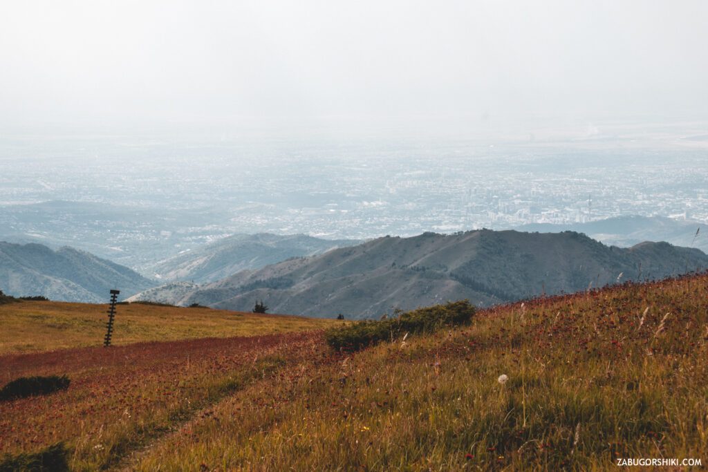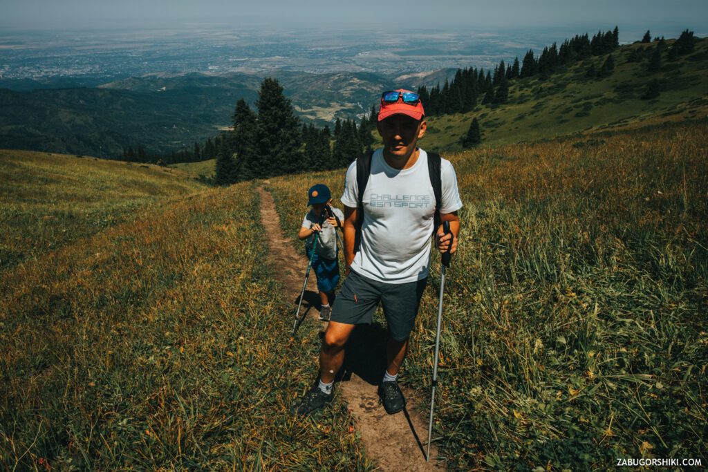 Прошли 8.8 км , набрали по высоте 1000 м. Лес резко обрывается и мы выходим на плато «мыс Надежды», с которой уже виднеется пик Нурсултан (бывш.Комсомол), пик Панорама, Кок-Жайляу, «город тысячи красок» и НАША ЦЕЛЬ!!!