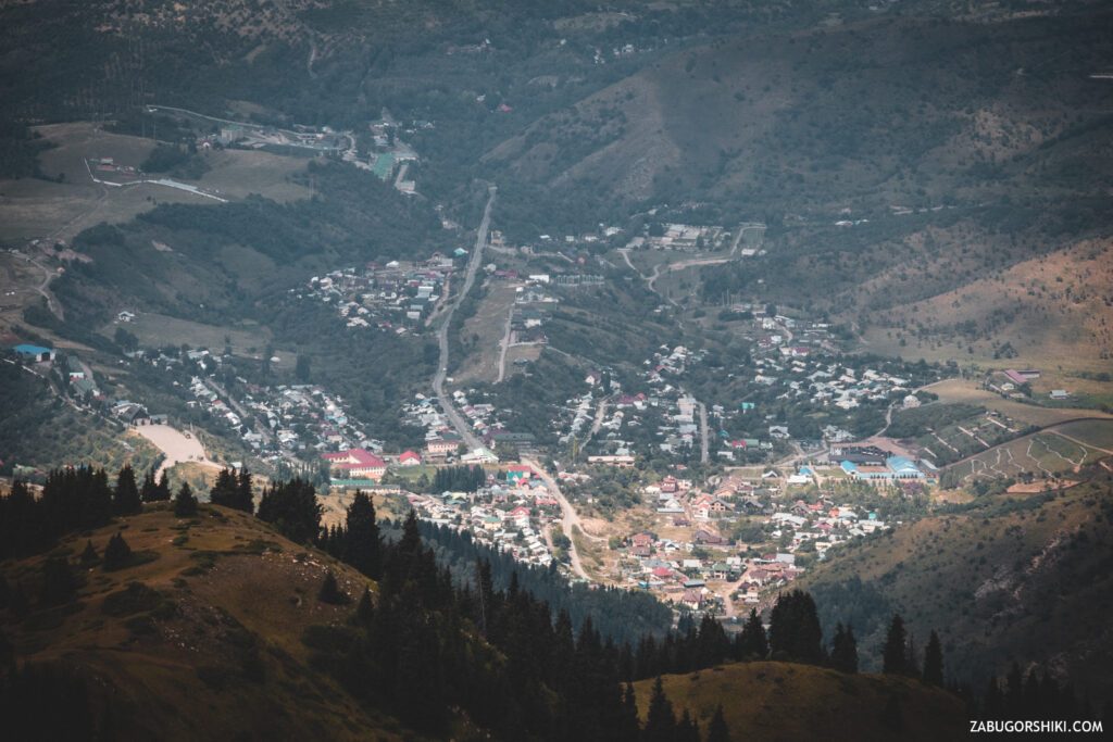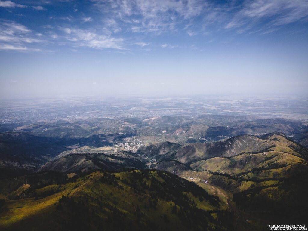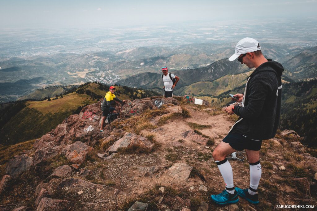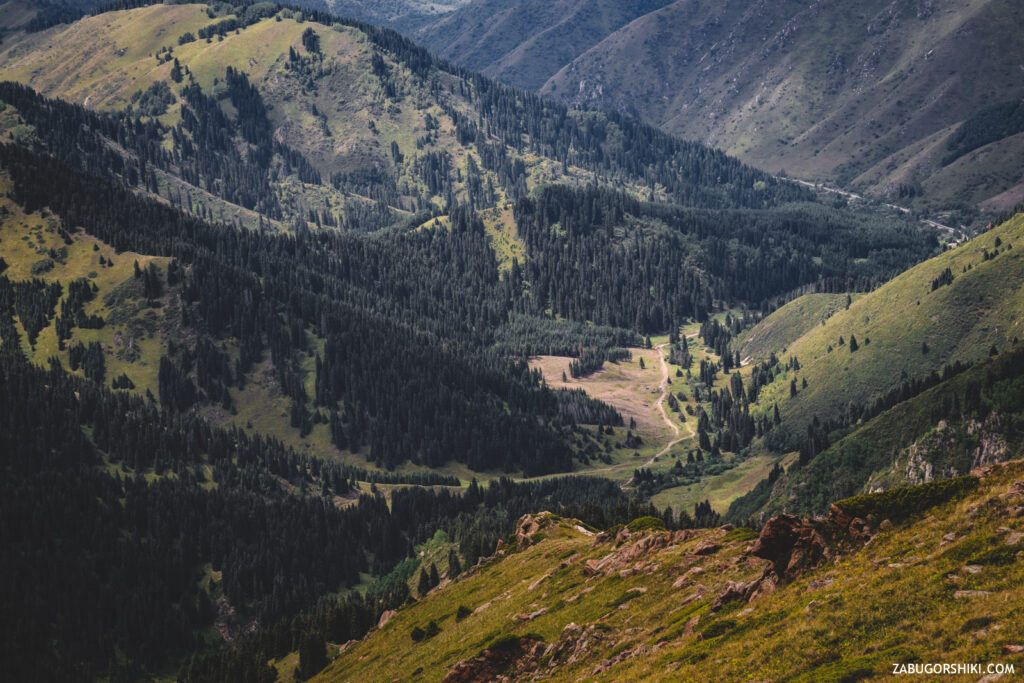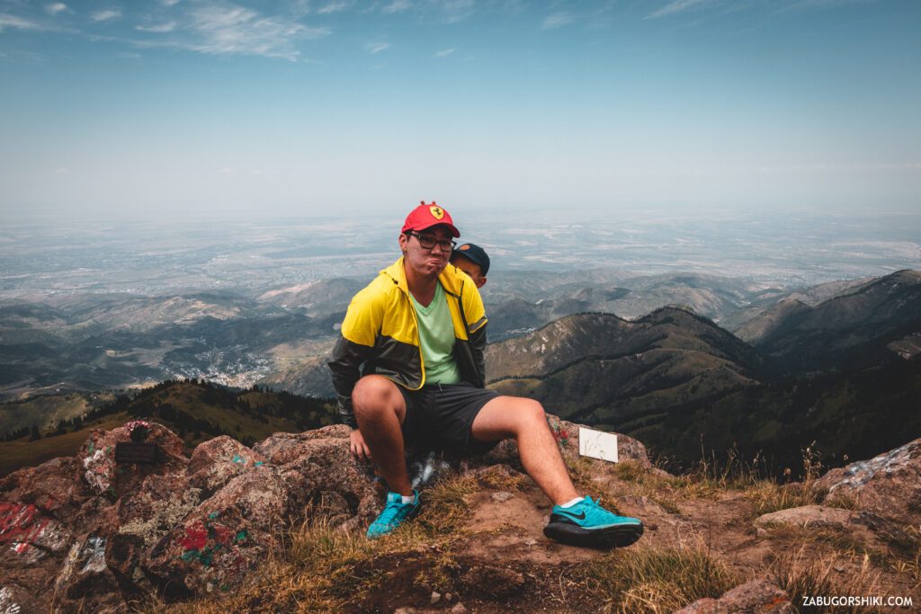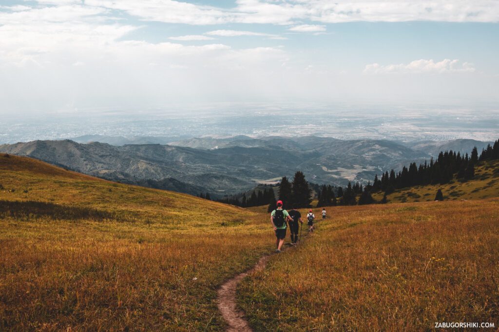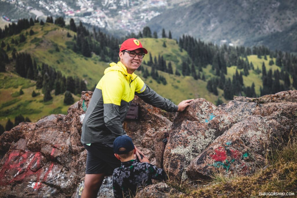 Прошли 8.8 км , набрали по высоте 1000 м. Лес резко обрывается и мы выходим на плато «мыс Надежды», с которой уже виднеется пик Нурсултан (бывш.Комсомол), пик Панорама, Кок-Жайляу, «город тысячи красок» и НАША ЦЕЛЬ!!!