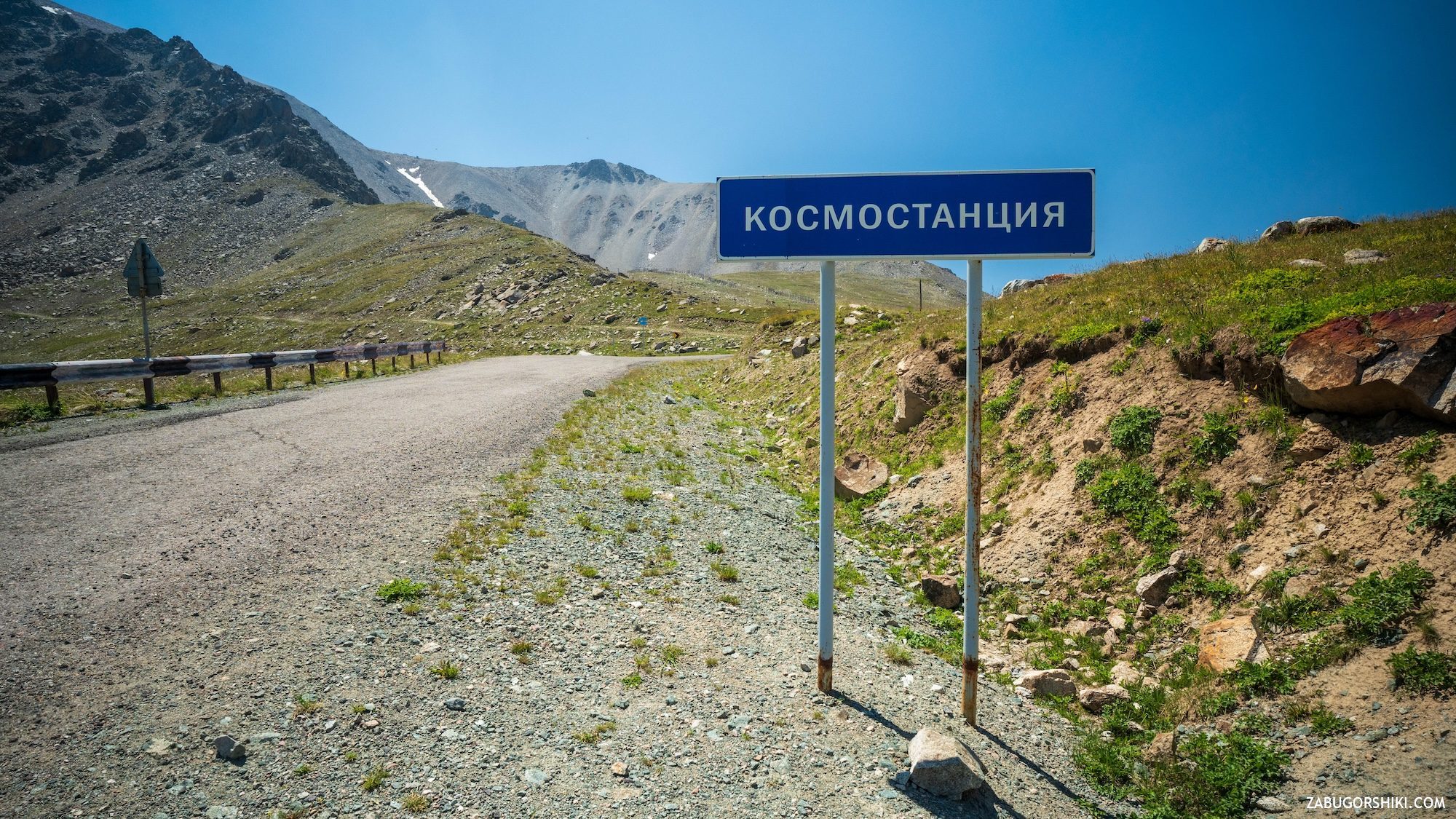 The final section from the observatory to the Cosmostation gains another 500+ metres on a deteriorating road/track that crosses the alpine zone — treeline falls away, vegetation thins to grass and rock, and the air becomes noticeably thinner. The Dzhusaly-Kezen Pass opens up as a windswept saddle between the peaks, with the Cosmostation’s low concrete buildings squatting against the weather.