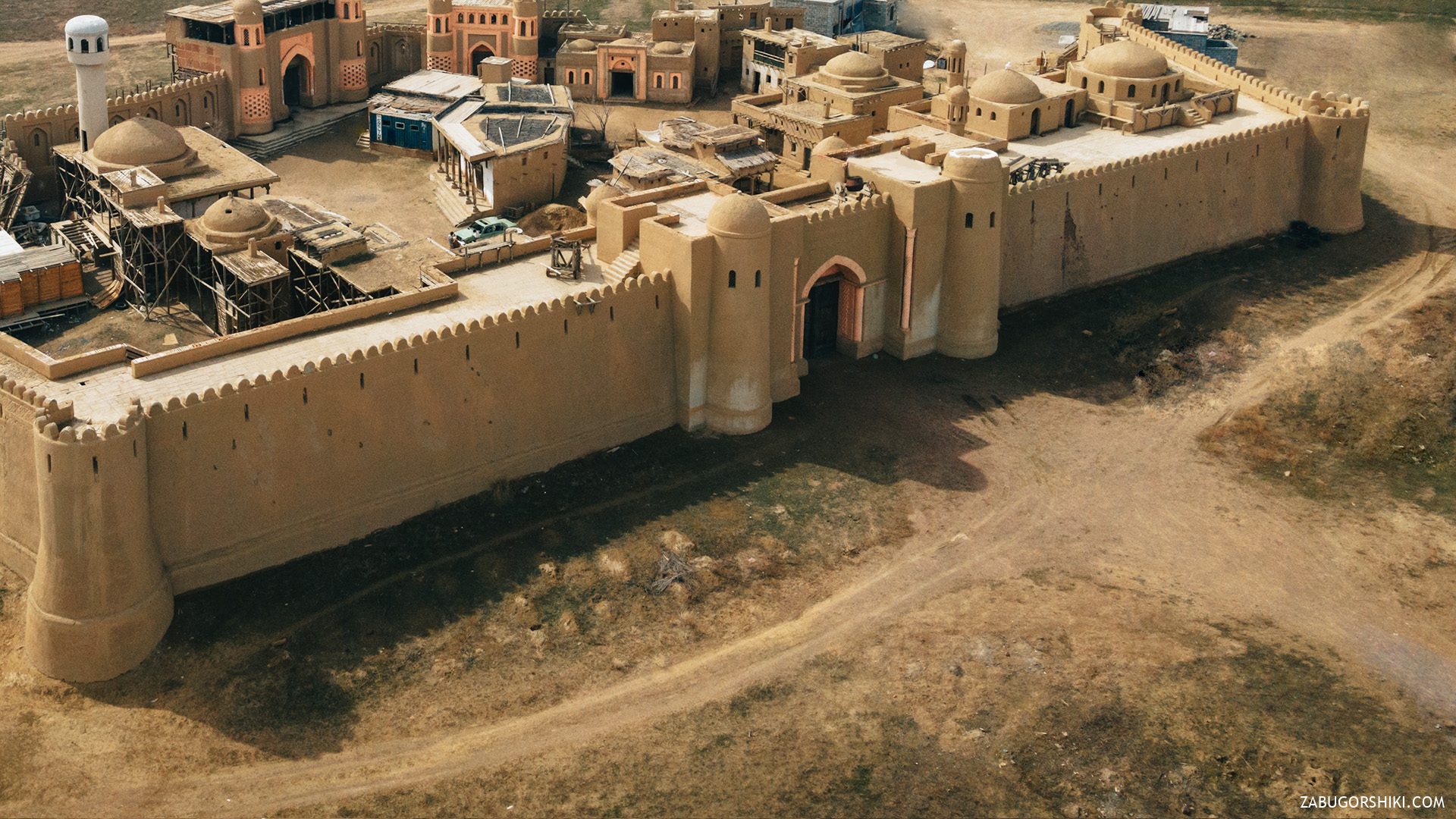 What you’ll see. The complex includes a massive gateway, fortress walls with towers, a mosque with minarets, a central square, a zindan (underground prison), craft workshops, a khan’s headquarters, and residential buildings — shacks, houses with arched windows, and structures with straw roofs. Everything was built from foam plastic covered in clay to look authentic on camera. Up close, it’s theatrical — ceramic-tile paint has peeled in places to reveal the construction underneath, and cardboard details have weathered — but the overall scale and setting against the steppe and hills is surprisingly atmospheric.