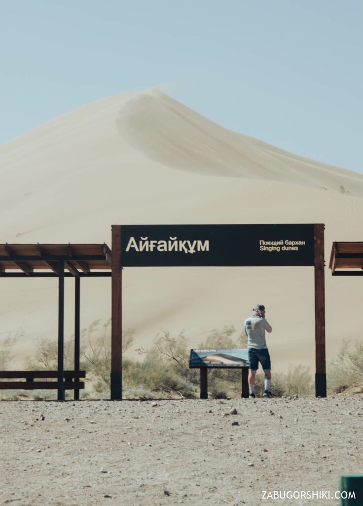 Note: Camping near the Singing Dune is prohibited. The nearest camping site is the Mynbulak ranger post, 10 km away. Toilet facilities and gazebos are available near the dune.