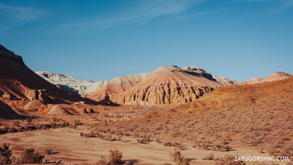 “Aktau” means “White Mountains” in Kazakh, but that undersells them dramatically. These are layered sedimentary formations created at the bottom of an ancient body of water — possibly the Tethys Ocean — during the Mesozoic era. Over 400 million years, different geological periods deposited different-coloured layers: white chalk, grey sandstone, red clay, green marl, blue-grey shale, pale yellow limestone. Erosion has carved these layers into ravines, canyons, and ridges that look like they belong on another planet.