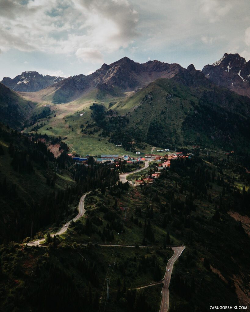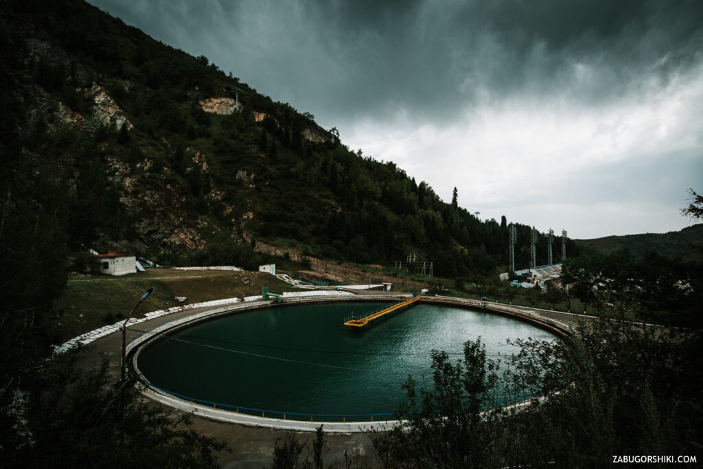 Пятиминутный привал завершился и мы, сделав глубокий вдох, продолжаем. Уходим направо и держимся левее (просто потом дорога расходится и нам надо левее). Пройдем по «старой» асфальтированной дороге, так как здесь нет машин. Проходим заброшенную закрытую башню и водосбросы плотины, площадку, с которой уже виднеется излюбленная всеми высота 3200 метров над уровнем моря — Чимбулак.