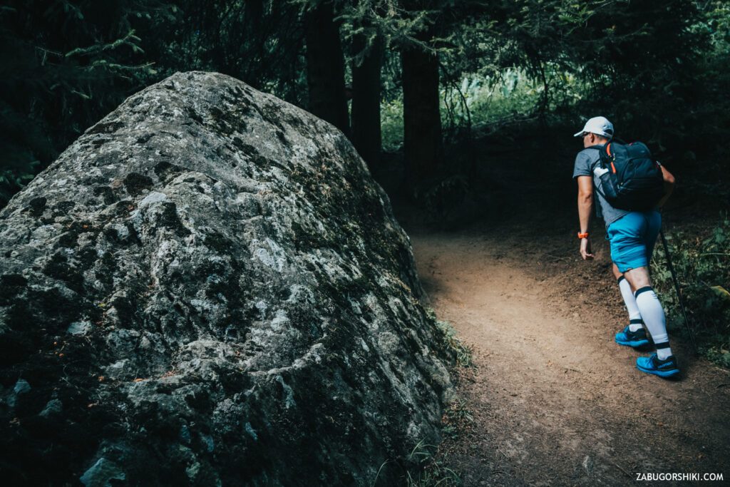 Подъем не заставил себя ждать! Тропа тянет штурвал на себя, проверяя нас на прочность. Но мы тоже «не пальцем деланы»). На пониженной передаче дорожка вела нас через «хвойные навесы», крутые подъемы, узкие проходы по склону с видом на ущелье, проходила ПОД и НАД поваленными деревьями, по прохладной тенистой части и, конечно куда же без нее, солнечной стороне рельефа.