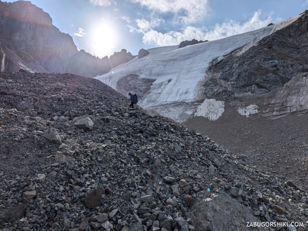 Спуск с перевала тоже был непростым — несколько камней улетели прямо на ледник, создавая грохот по всему цирку ледника.
