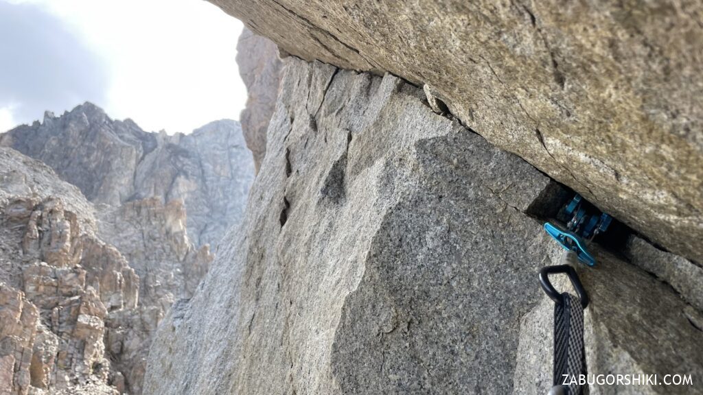 Когда мы подошли к внутреннему углу, стало очевидно, что движение одного камня может вызвать обрушение всей верхней части склона. Все камни оказались «живыми» (нестабильными), а вопрос «как потом спускаться?» заставил нас серьезно задуматься.