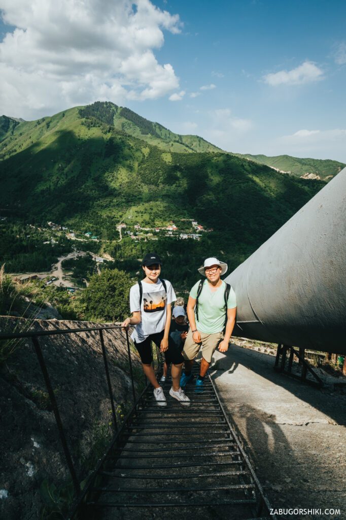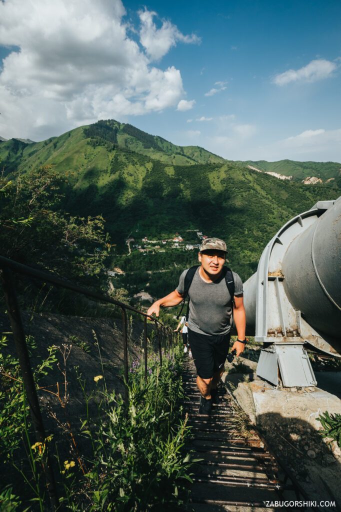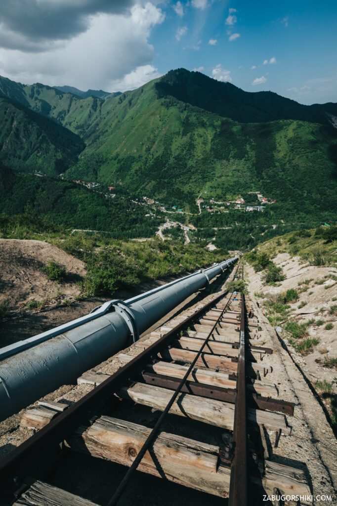 Всю дорогу на верх из трубы доносится шум, летящей по ней воды. А если прикоснуться к трубе, то можно почувствовать насколько она холодная. Протекая по трубе, горная вода своей мощью разгоняет турбины ГЭС, которая в свою очередь питает город энергией.