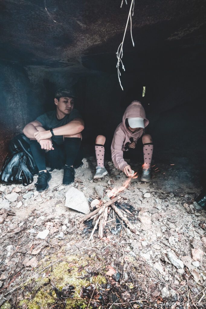 Понимаем, что хоть краем, но эта туча нас зацепит и думаем где бы укрыться. Нашли вполне пригодное место как раз к моменты начала дождя. Собрали немного хвороста и сухих дровишек, чтоб согреться если все это затянется на долго.