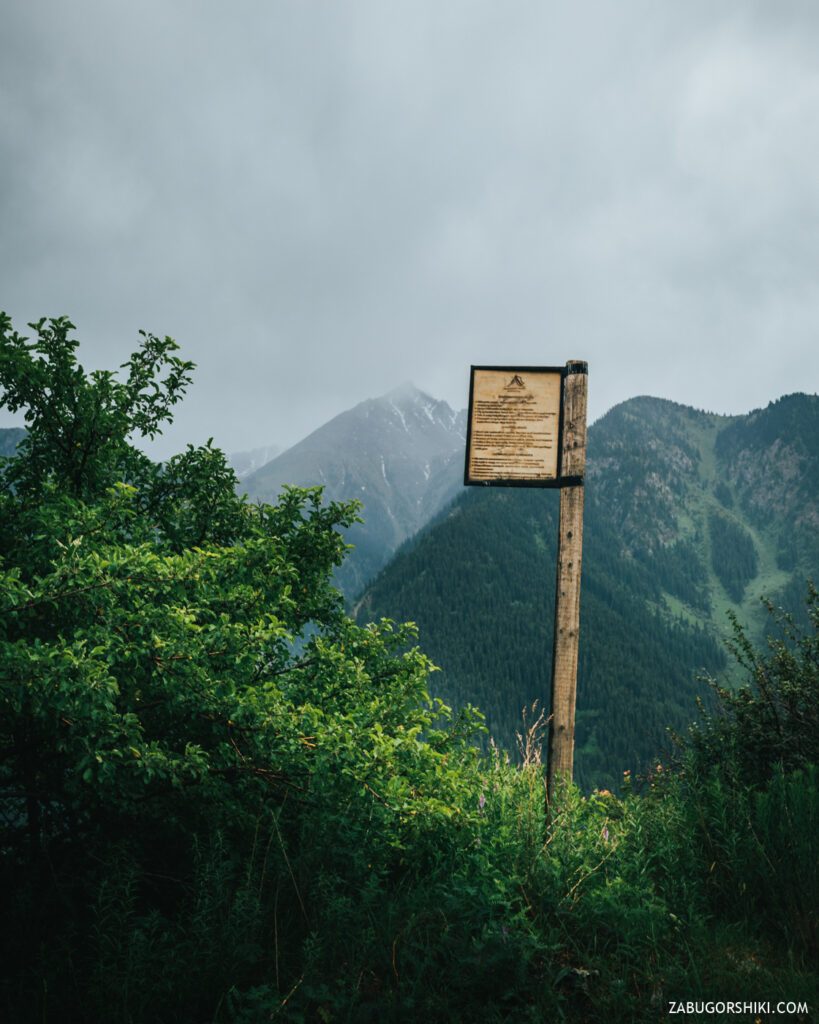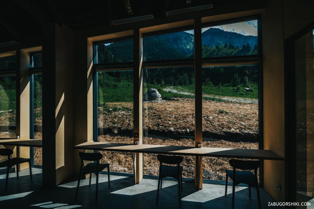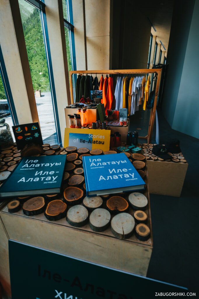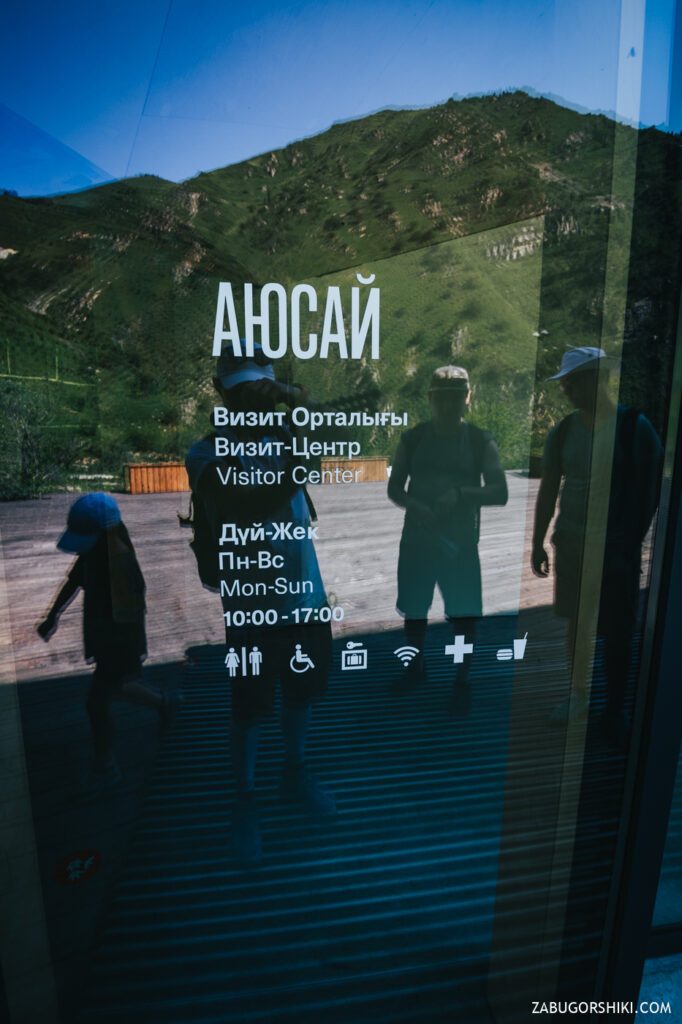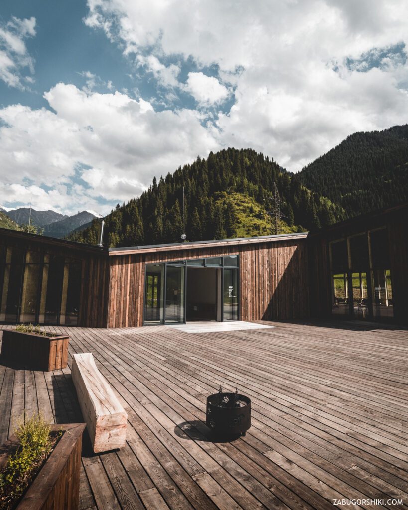 Забегу вперед и скажу, что мы посетили этот оплот экологического туризма, в котором по словам местных «друидов» и прочих персонажей, пытающихся втюхать правильное хождение по горам, все сделано из экологических материалов и без использования бетона. Весь этот разговор происходил в большом выставочном холле залитым полированным бетоном… Крыша напоминающая рельеф гор, много информации для начинающих туристов, лектории, буклеты и свой мерч. Большая открытая деревянная терраса со скамейками из павших в бою энтов (могучие деревья из леса Фангорн, ярые ненавистники орков). Касательно платных процедур нам точного ответа не дали, но намекнули на возможность обговорить все с гидом-менеджером. Так из развлечений есть электровелосипеды, которые по предварительной брони для вас зарядят, прогулки по местным тропам. В скором будущем появится палаточная площадка и место для «глэмпинга». Не смогли мы пройти мимо эко-уборной, стоимостью в 150 тенге. Узнав цену, остановились на том, что и снаружи вид не плох. В общем и целом из бесплатного тут только послушать введение и погладить ласковую кошку, которую именито зовут Аюсай. Больше информации можно узнать из первоисточника прямо на месте. Правда добираться туда, а потом пилить обратно не очень прикольно.