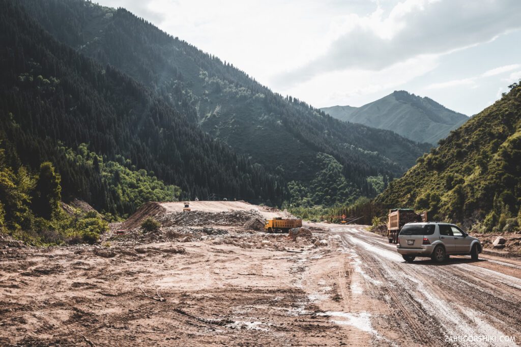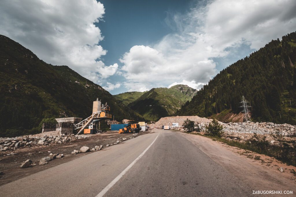 Дорога до серпантина была полна песен, смеха, огромных шмелей и позитива. Точно не знаем когда, но появился хороший мостик через реку Большая Алматинка. А дальше по асфальту минут 10 мы шли до «прекрасного эко-творения». Поблуждали самую малость и снова наматывать пробег. Дошли стройки плотины. Судя по всему происходящему, это мероприятие на долго. Грязи налипло на обувь больше, чем на всем пути пребывания. Так как транспорта тут нет, от слова совсем (конечно кроме служебных), до точки отправления мы шлепали еще добрых часа 1,5.