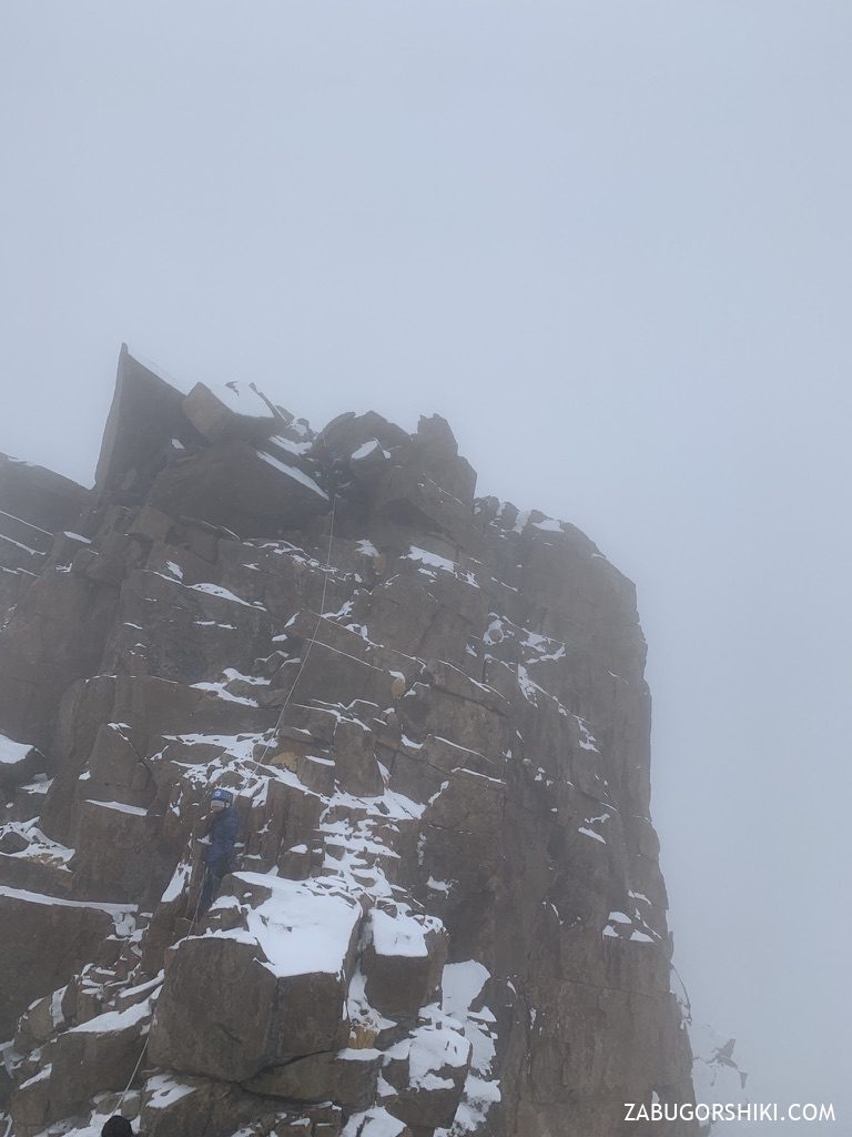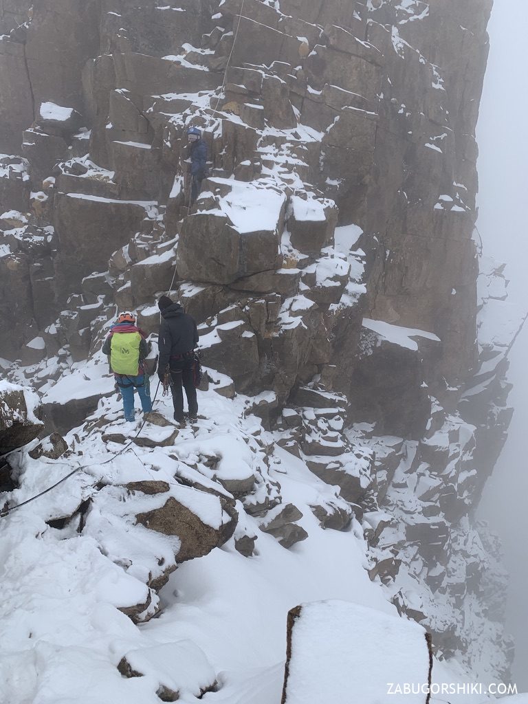 Данный маршрут мы проходили в одновременной страховке, но в качестве тренировочной горы можно учиться ставить точки, так как гора хорошо для этого подходит (закладки / френды)