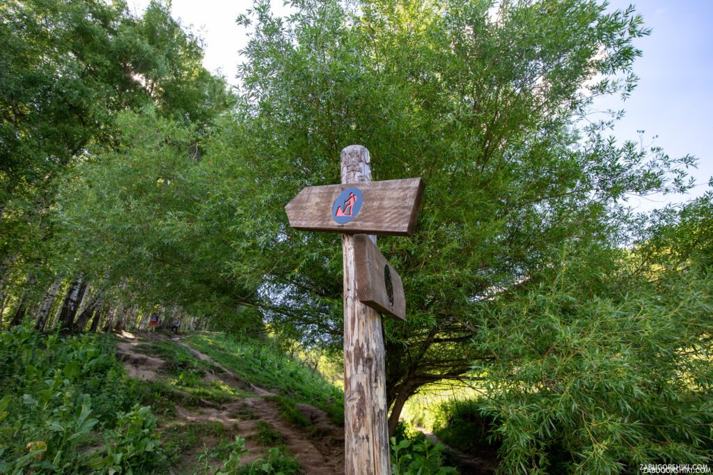 Далее нам снова встречается указатель. На этот раз можно пойти налево через березовую рощу (маршрут для более опытных ходоков) и направо, по более пологой тропе.