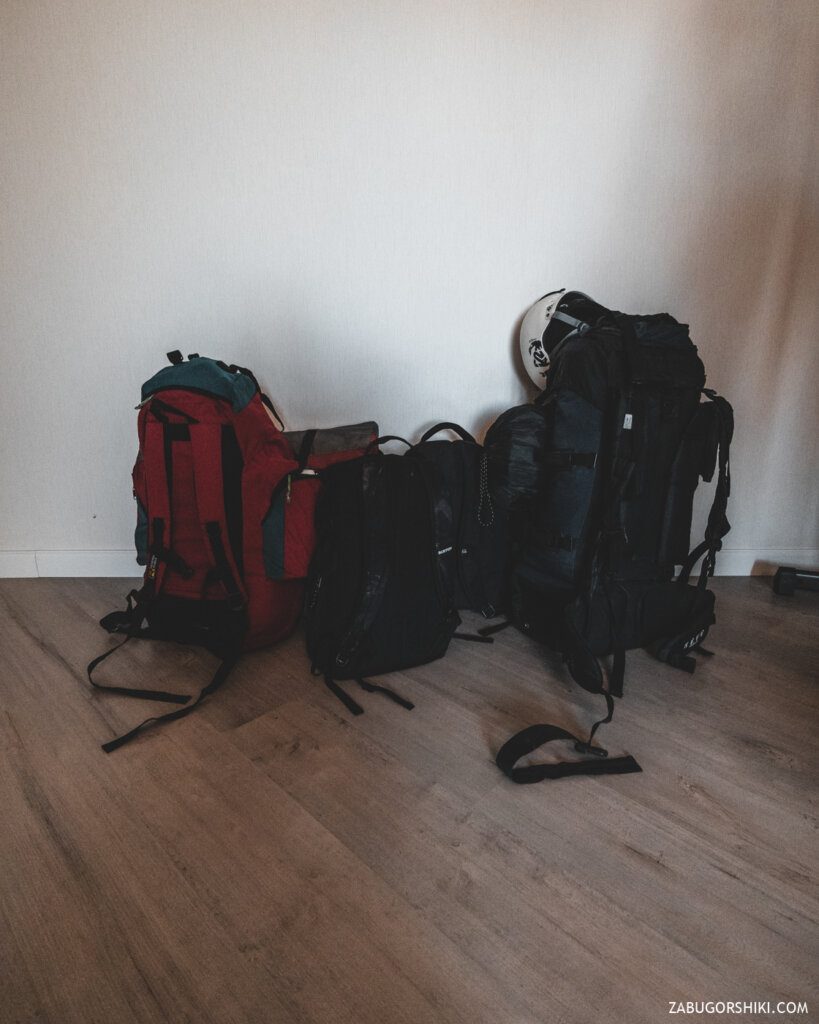 В коридоре у него лежала такая же кипа вещей и плюс ко всему альпинистское снаряжение. Кошки, веревки, карабины, обвязки, фонарики. Ух, куда бы это впихнуть. На рубрику «упаковка» ушло ещё добрых полчаса.