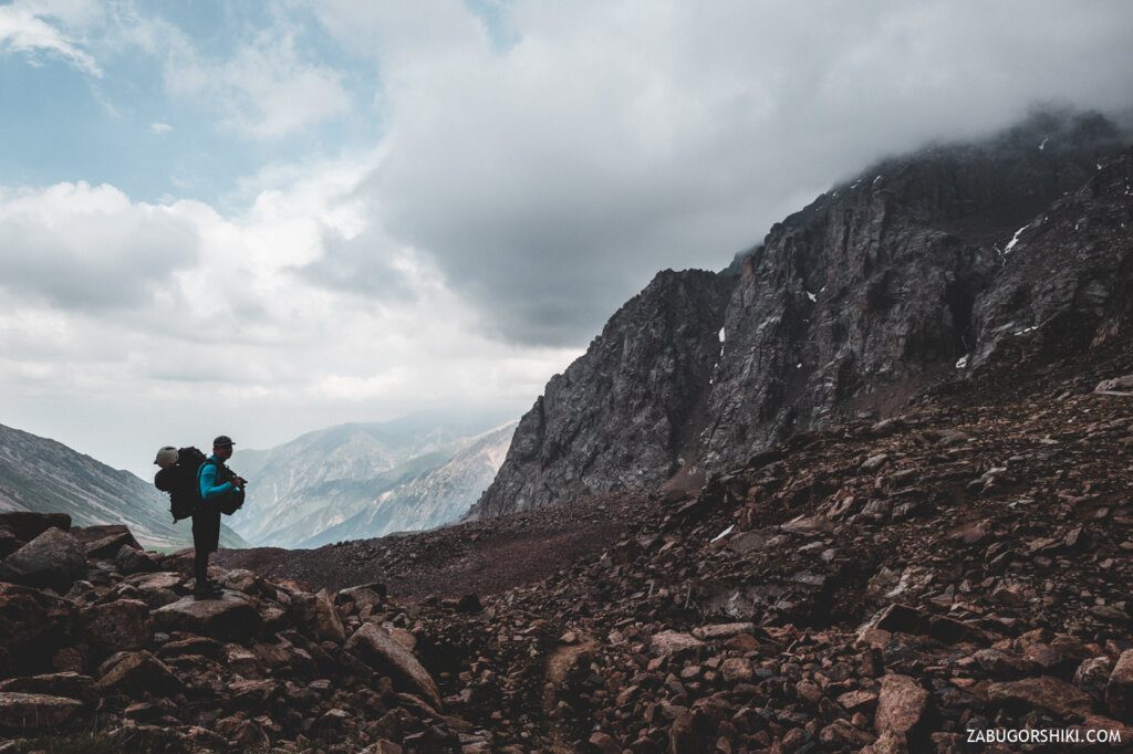 Спускались к лагерю у подножия очень аккуратно, чтобы случайно не спустить камень на людей. Шагая по размытой породе можно ненароком сесть на шпагат, если до этого он у вас не получался). Вновь оказавшись на перевале, захотелось нам прогуляться на Карлытау. Тем более очереди там нет, да и идти куда легче, чем на сразивший нас. Но перед тем, как отправиться на него, я уточнил у блюстителей горного порядка «можно ли идти на Карлытау?», на что получил вполне утвердительный ответ «Конечно!».