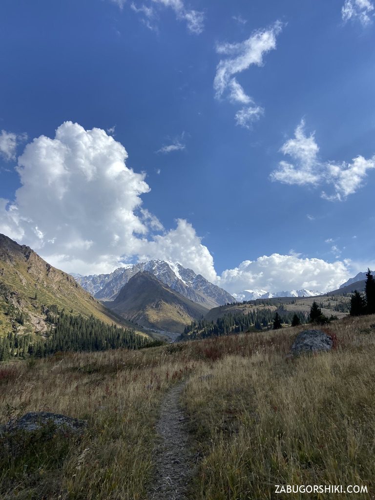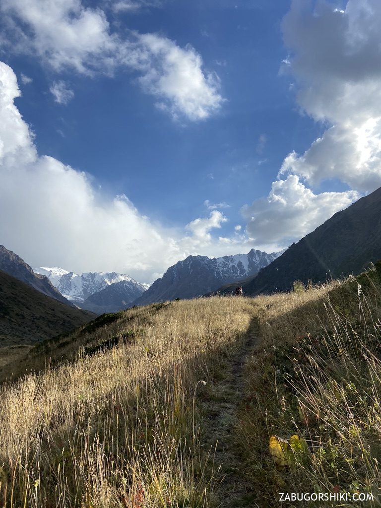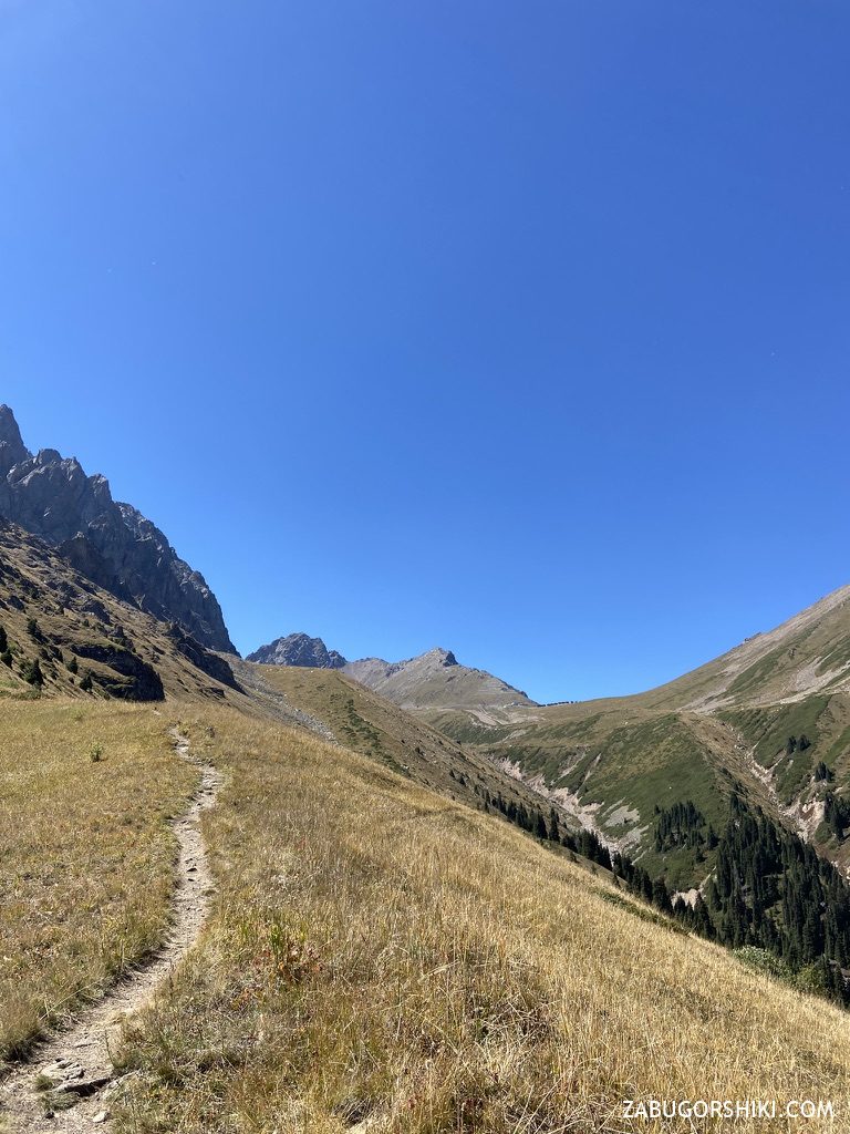 С Талгарского перевала начинаем спускаться в ущелье Левый Талгар по комфортной тропе. Сначала спуск пологий, но дальше будет становиться все круче и круче.