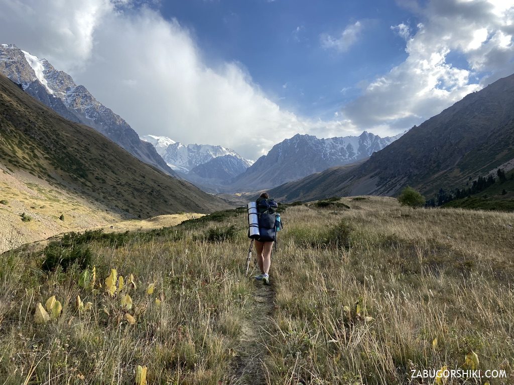 На второй день наша задача проста — дойти до перевала Туристов, перелезть его и спуститься вниз до куда сможем/успеем. Поэтому начинаем идти — тропа все также хорошо видна и будет плавно вести наверх, в правую сторону ущелья.