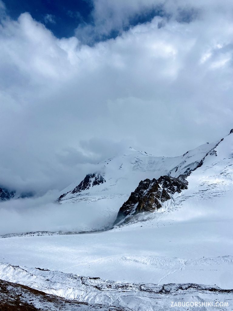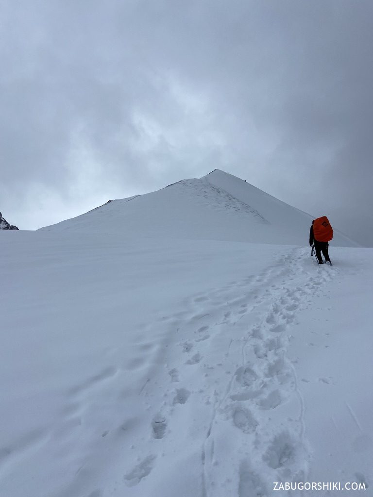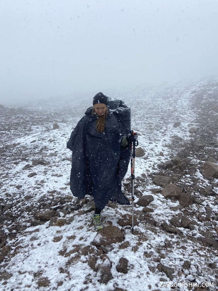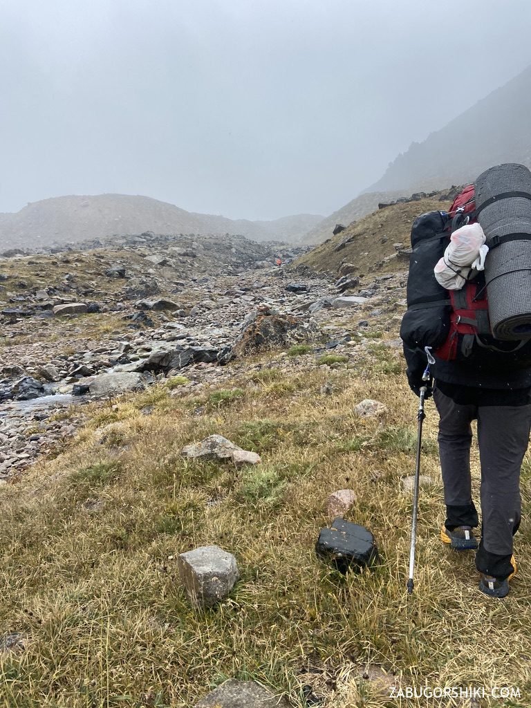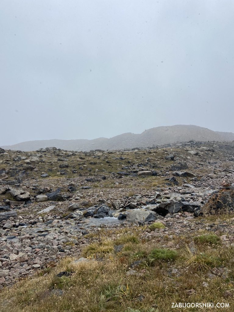 По ходу подъема на перевал спустя два часа погода стала довольно быстро и сильно меняться — спустился густой туман, стало довольно прохладно и пошел мелкий снег. Мы старались не останавливаться, решили не переобуваться и продолжили идти дальше и выше.