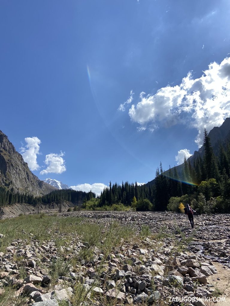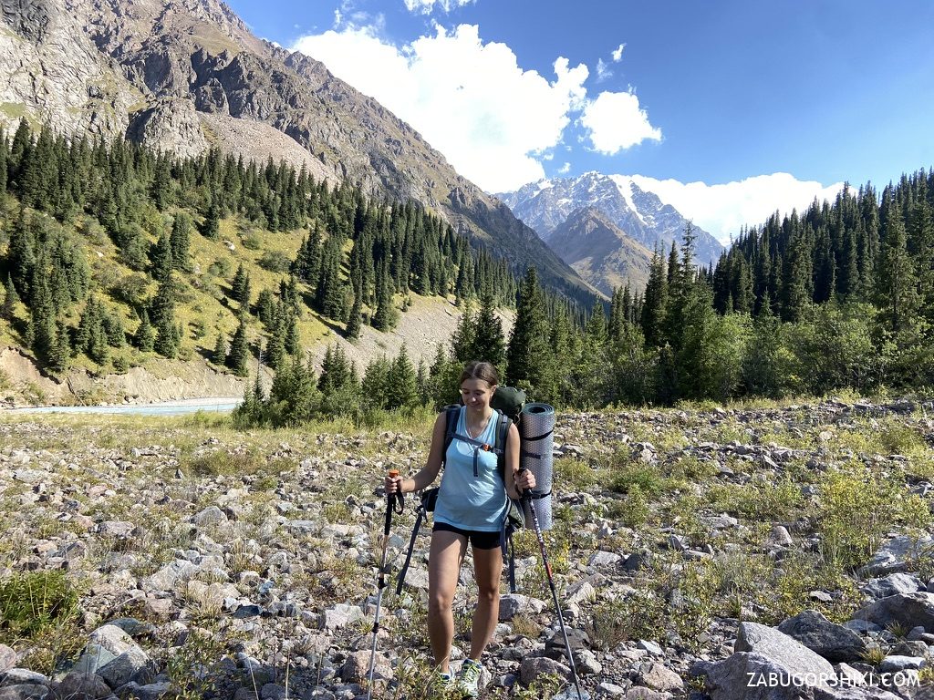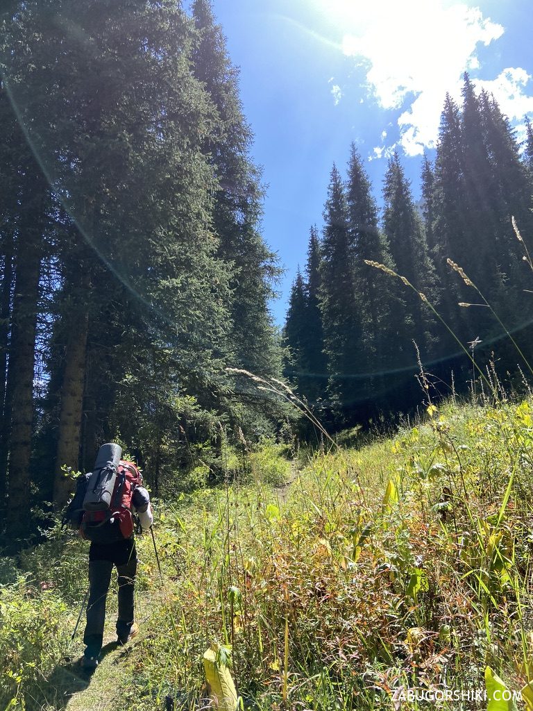 Начали наш маршрут мы в 11:40 и к 15:30 дошли до селевого выноса. К этому моменту идем уже 4 часа. В первый день мы решили дойти дальше Солнечной поляны, чтобы на следующий день быстрее подняться на перевал Туристов, так как обещали плохую погоду.