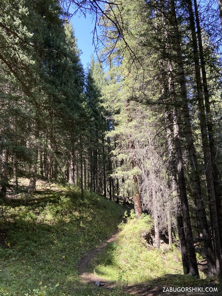 Вышли около 10:30 и поспешили вниз. Благо, погода стояла неплохая — хоть и яркого теплого солнца не было, но свежесть и прохлада была, а осадков нет. Маршрут приятный, чуть дальше начинается практически дорога, так что спускаемся быстро.