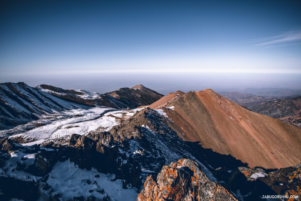 Вдоволь насладившись происходящим, мы решаем зацепить по пути пик Память, посвященный погибшим в Афганской войне. Почему я узнаю об изменении маршрута во время маршрута, Ренат так и не ответил. Но ни сколько не сомневаясь в успехе нашей кампании, отправляемся к скале. С перевала казалось, что дорога не займет много времени и будет не сложной. Но как бы не так!!! Хребет, покрытый острыми и обрывистыми камнями, извилистой тропой и прочим «весельем», занял чуть больше 30 минут. Подъем на пик не самый простой, с одной стороны острые камни, с другой — обрыв метров 150 (мамам читать запрещено)). С пика открывается отличный вид на город и на удивление хорошо ловит связь.