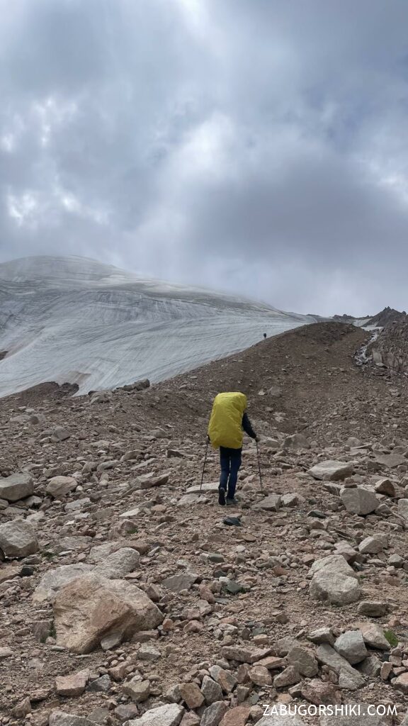 Наш выход начался не слишком рано – встреча была назначена на 7 утра. Рюкзаки оказались совсем не легкими! Спустя долгих 1,4 часа мы добрались до плато Мынжылки, а еще через некоторое время уже стояли на гляциологической станции Т1.