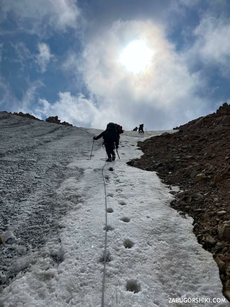 Спустя час мы подошли к леднику. Надели каски, кошки, обвязки и подошли еще ближе к леднику, где связались. Язык ледника прошли быстро и почти незаметно, довольно быстро подошли к взлету – началу технической части маршрута.