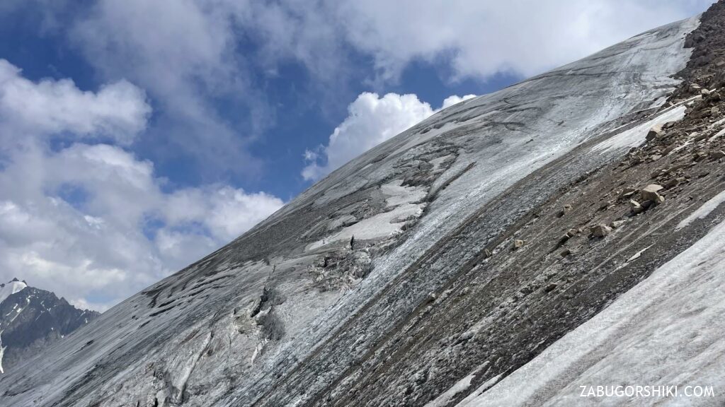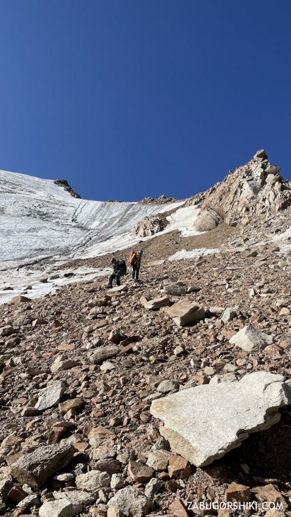 Вышли на контрфорс пика Молодежный и по нему стали спускаться. Камни летели из-под ног, а те, которые улетали в сторону ледника Кумбель, летели с невероятной скоростью и звуком.