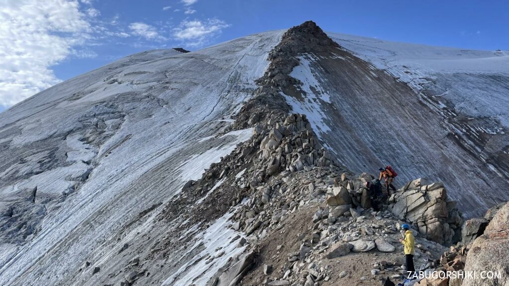 Пик Молодежный высотой 4150 метров известен своим массивным видом из Малого Алматинского ущелья. Хотя большинство туристов поднимаются на вершину по простому юго-западному гребню (маршрут 1А), альпинистов также манит эта гора. Мы решили пойти по непростому маршруту – северному гребню пика Молодежный, который был проложен в 1940 году группой инструкторов альплагеря Туюксу под руководством Е. Алексеева.