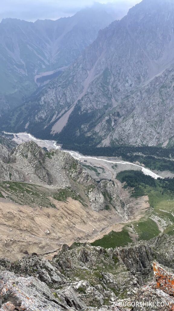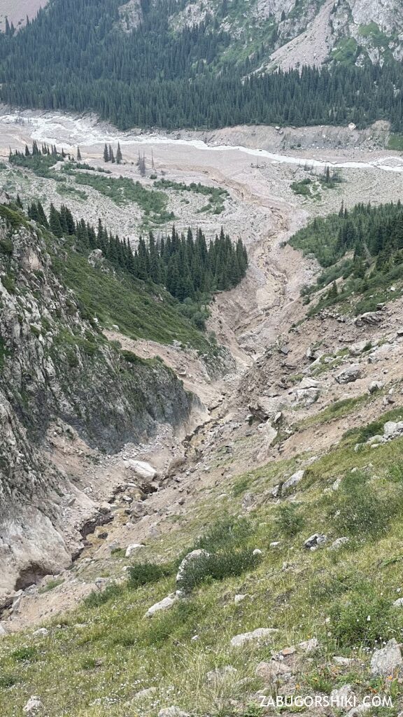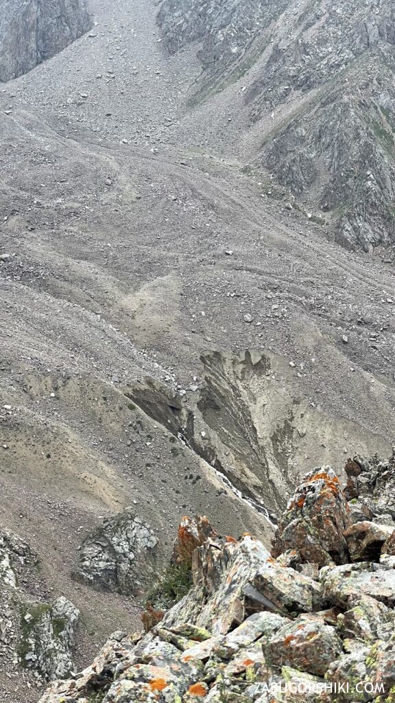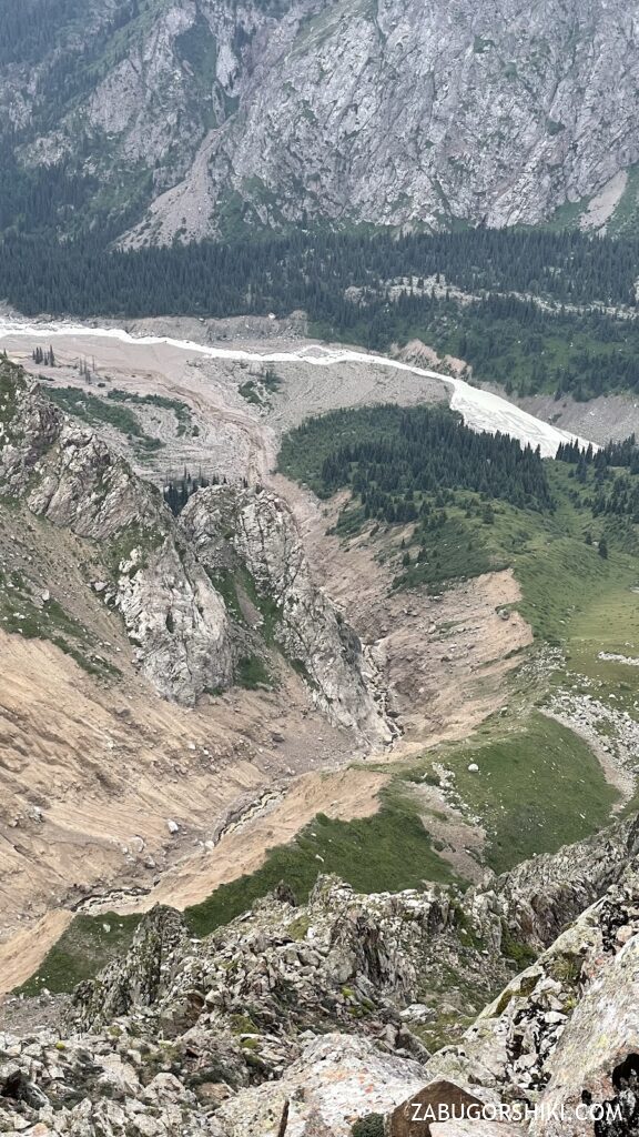 В какой-то момент гребень начал уходить в непонятном направлении, и я решил держать курс правее, к обрыву. Меня интересовали последствия селя, который сошёл с перевала Комсомольский и ледника Аристова.