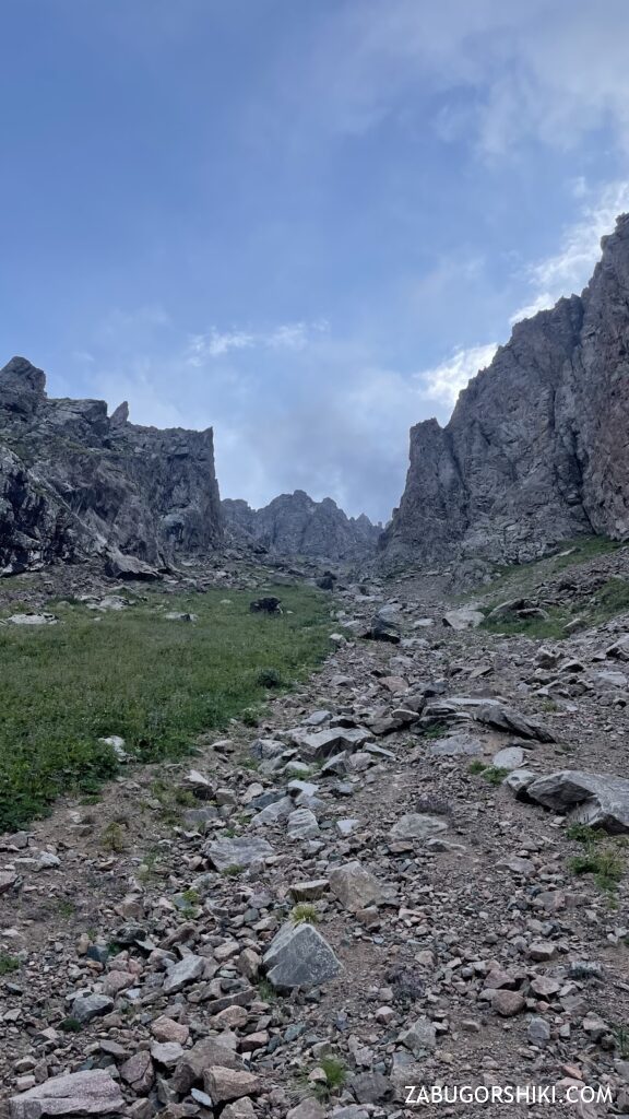 Я продолжил подъём по кулуару в направлении правого перевала. Его не было видно, и подъём казался бесконечным. Примерно через час траверса с одной стороны кулуара на другую (из-за крутизны склона) я увидел с правой стороны седловину, выбрался на неё и сел отдохнуть. После отдыха я понял, что прошёл самую сложную часть маршрута. Оставалось только подняться на вершину!