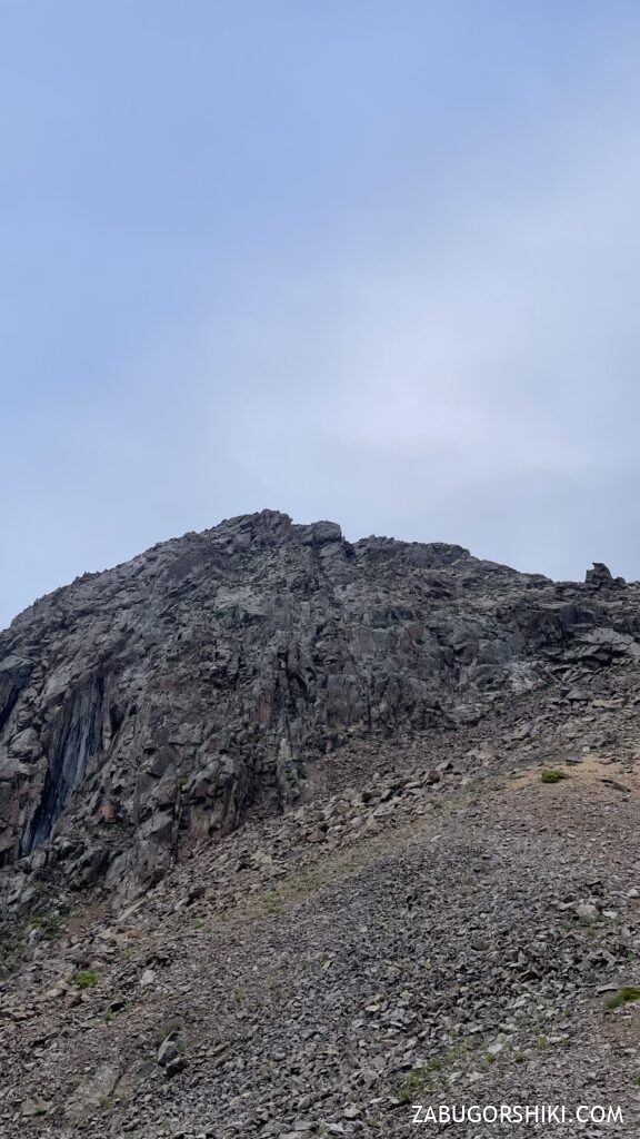 Двигаясь от перевала к пику Акустический, я подошёл к скальному массиву и обнаружил, что там нет особых скал — только развалы камней, которые легко обойти. Страховка здесь была бы неэффективна: в случае срыва скальный блок, на котором закреплена петля, мог бы отправиться в свободное падение вместе с вами! Поэтому лучше просто обойти эти развалы, что я и сделал.