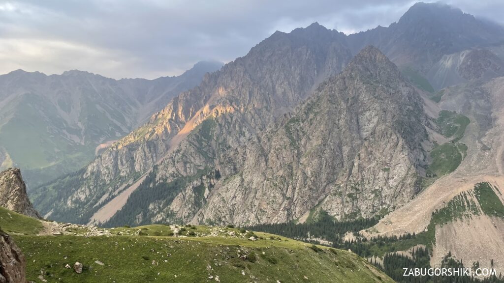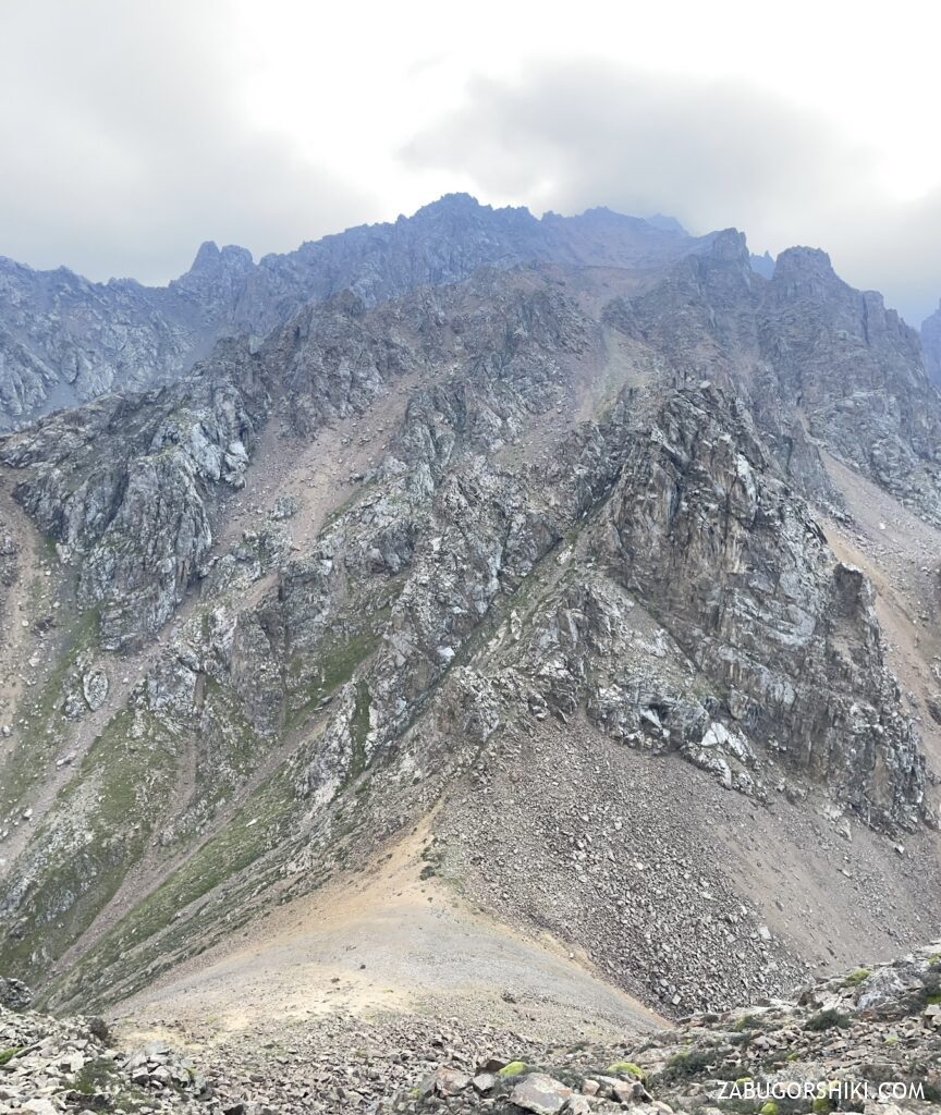 - Долину реки УлькенМынжылкы с такими вершинами как Левый Богатырь в обломках, острый САШИА, самый высокий — пик Пушкина, за которым скрылся Кыйрагантау
