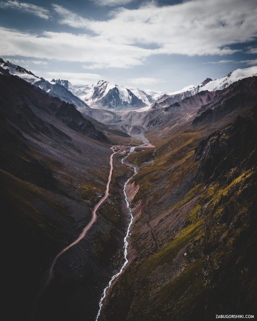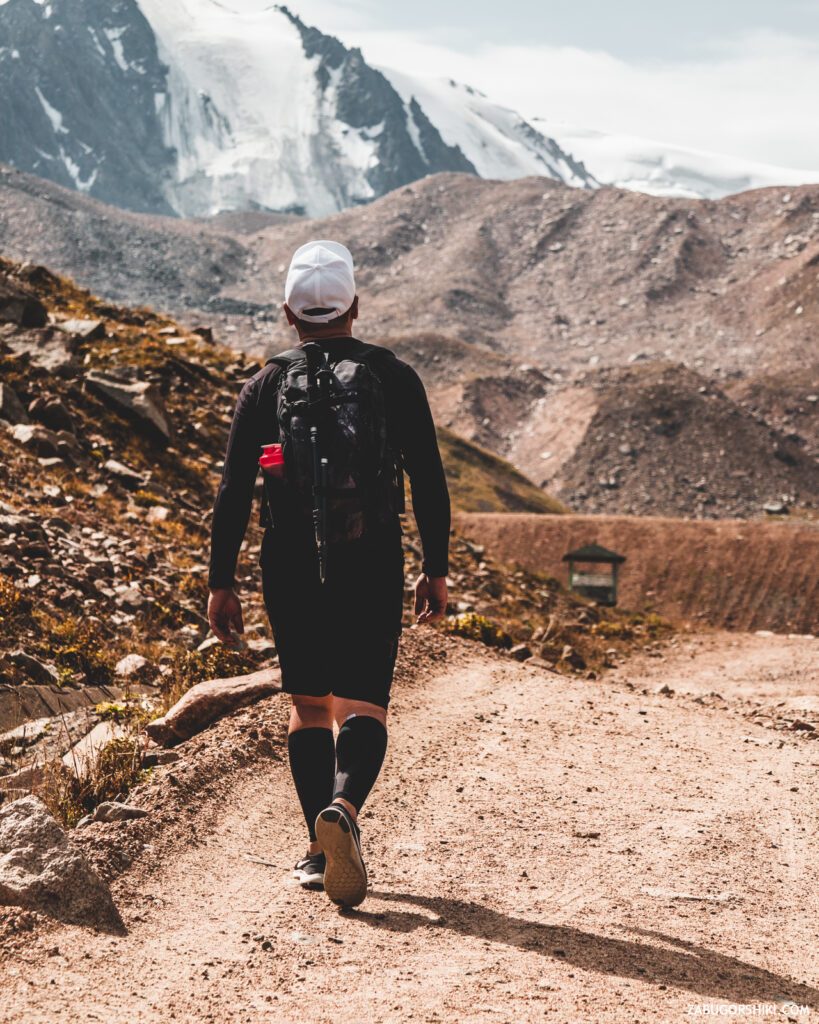 Налюбовавшись красотой, продолжаем путь. Движемся прямиком по асфальту, который в скором времени закончиться и придется шлепать по грунту, камням, осыпи и прочей породе. Уклон у тропы небольшой, но все равно чувствуется нагрузка. По пути встретятся мемориал «Погибшим в горах» и колокол, в который можно позвонить. Альп-лагерь Туюк-су, в котором учат правильно ходить по горам и прочим приколюхам. Зона отдыха Хан-Тенгри, которая больше похожа на заброшенную дорогую баню).