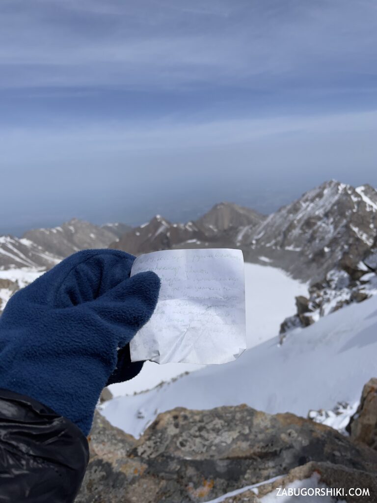 После нескольких фотографий мы решили начать спуск. Удивительно, но записка, найденная нами, хорошо сохранилась, несмотря на 13 лет пребывания в горах. Мы вернули её на место и начали спускаться.