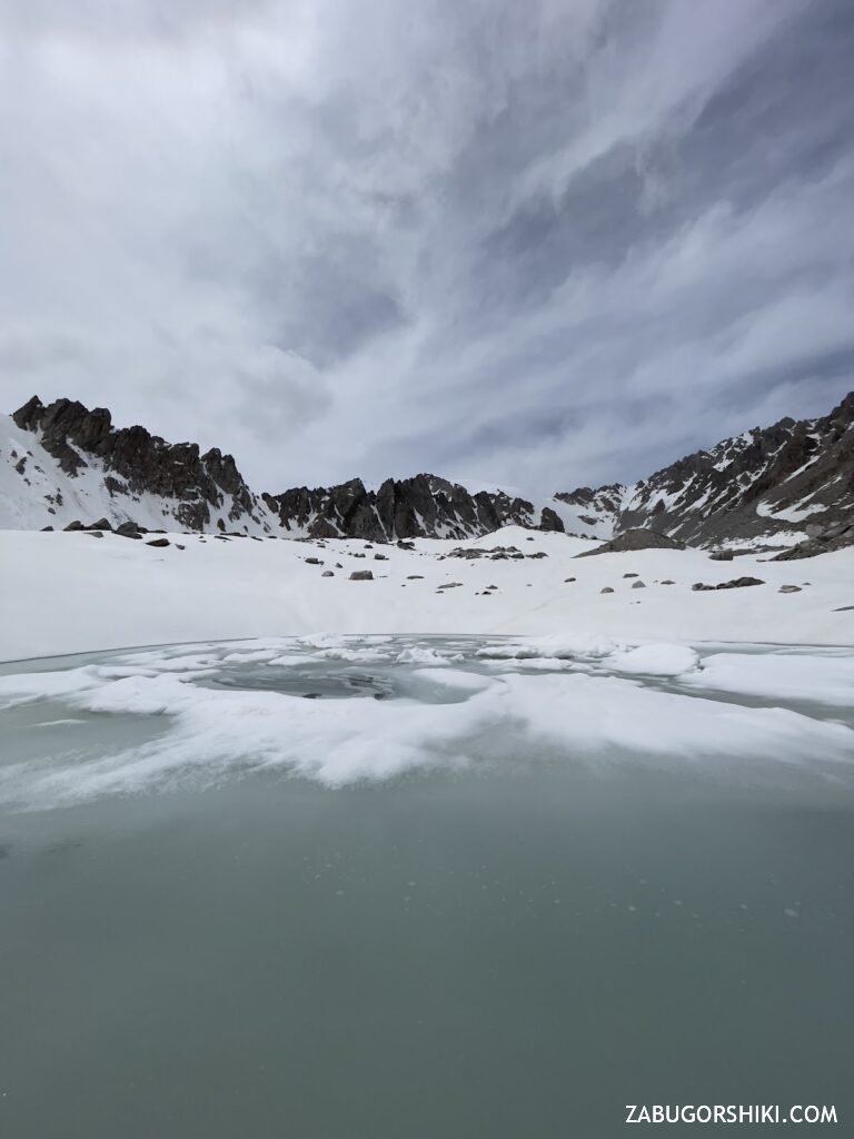 На морене мы обнаружили небольшое озеро с удивительно большой глубиной – около 18 метров. Это типично для моренных озер. Оно было наполовину покрыто льдом, что придавало ему особую красоту.