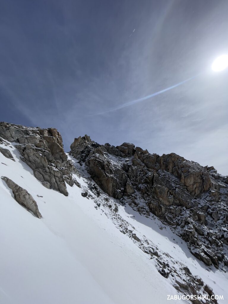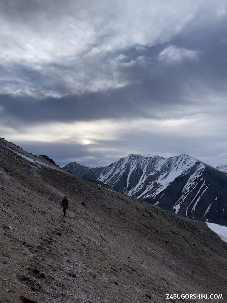 Подъем был действительно сложным – крутой градус наклона, трудный рельеф и отсутствие видимости цели не давали покоя. Мы шли долго и упорно! Спустя некоторое время мы увидели перевал, по ошибке поднялись на него, поняли, что что-то не так, спустились на 100 метров и вошли в правильный кулуар. Наконец-то нашли заветный маршрут, хотя выглядел он устрашающе сыпучим.