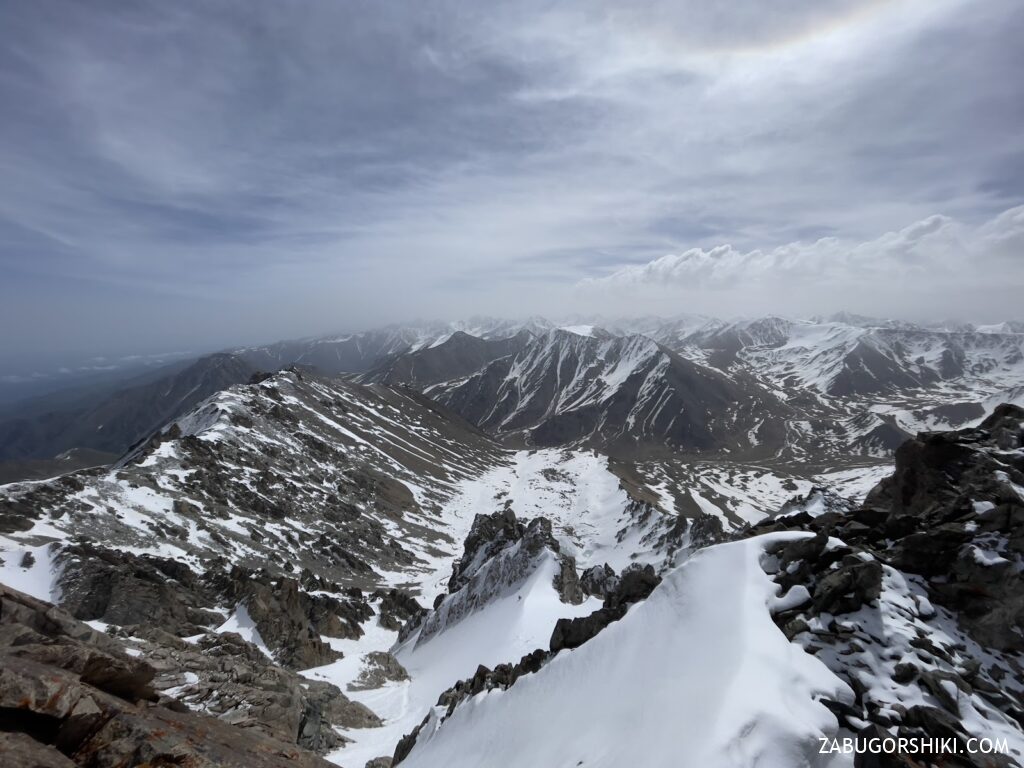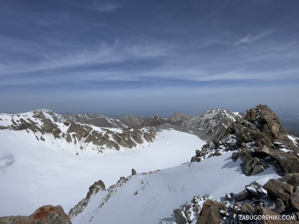 С вершины открывался потрясающий вид на цирк пика Октябрь и пик Турист Казахстана. Интересно, что внизу слева был виден маленький холмик – это гора Вечерняя высотой 4330 метров.