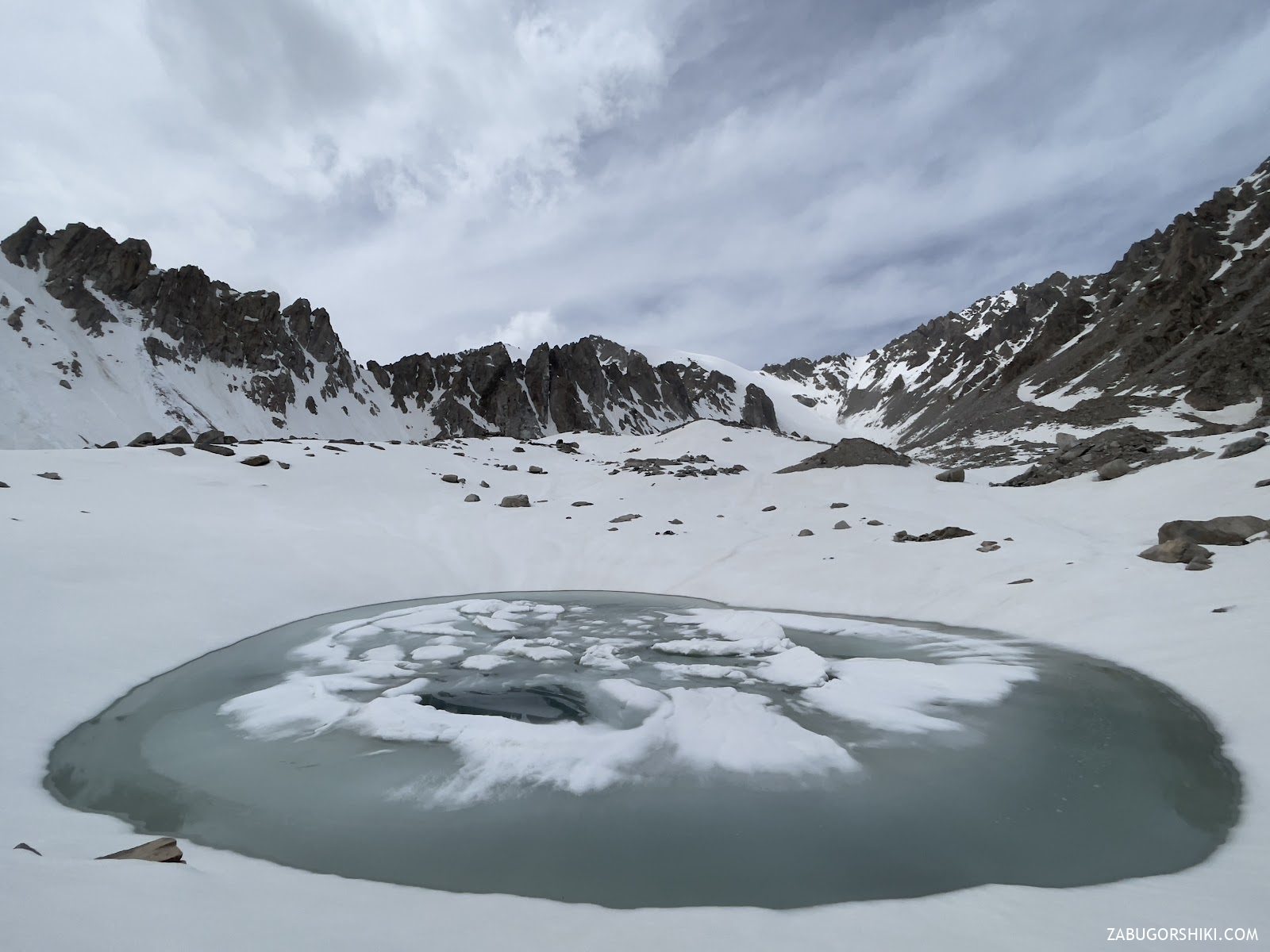 Технический участок мы прошли с помощью дюльфера (спуск по веревке), иначе было бы слишком сложно. Остальную часть пути мы спокойно спускались по снегу до каменистого участка. Спуск был быстрым – за час мы добрались до озера.