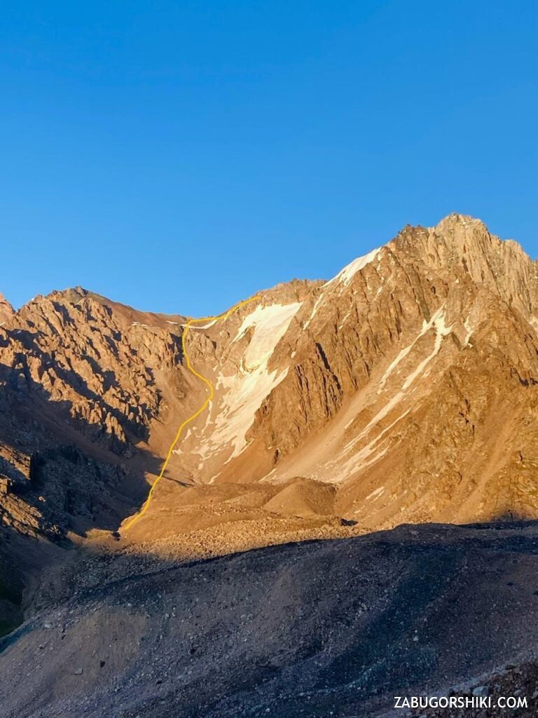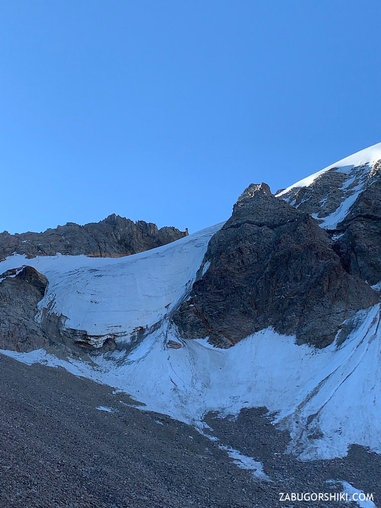 От Чёрного Камня продолжаем движение в сторону ледника Маяковского. Обогнув его у подножия, выходим в нижнюю часть ледника. Далее поднимаемся по морене, затем по самому леднику — к основанию характерного кулуара на фото ниже.
