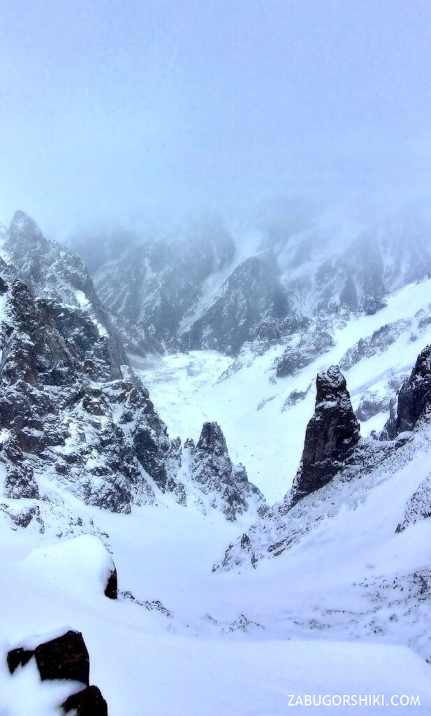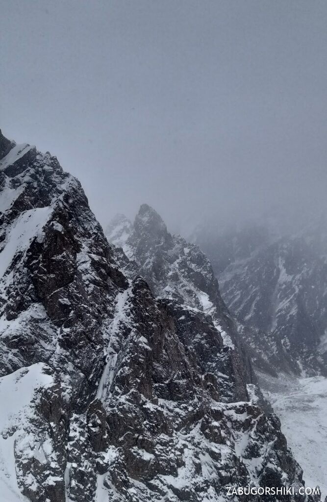 Слева идет отрог ведущий к Физкультурнику, не туда а прямо по холодному леднику. Б-ррр.