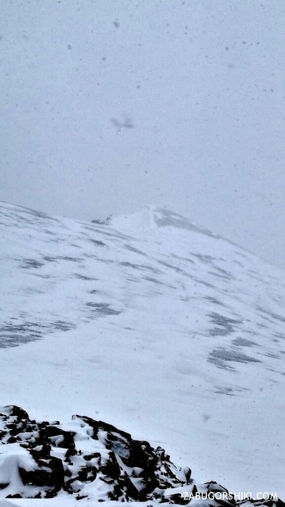 Погода снова решила пошутить. Пошли крупные хлопья, видимость резко упала. Пока шёл вверх, всё было прекрасно, а тут за минуту будто выключили свет.