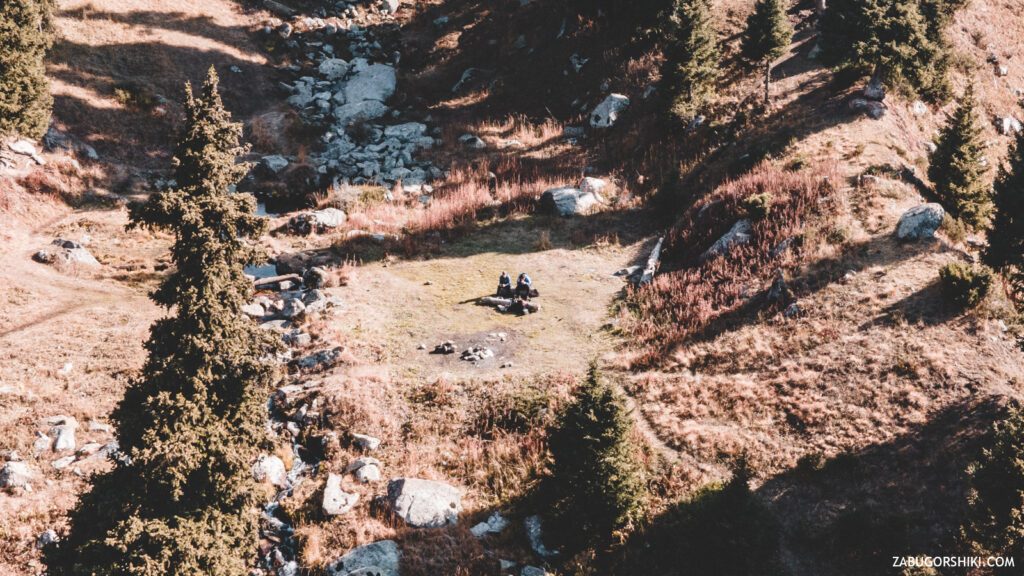 Перейдя «реку» вброд и немножко поднявшись вверх, выходим на очередное место отдыха, с которого открывается отличный вид на реку, ущелье и горы. Здесь же можно сделать недолгую передышку, осмотреться и вновь «переставлять ноги».