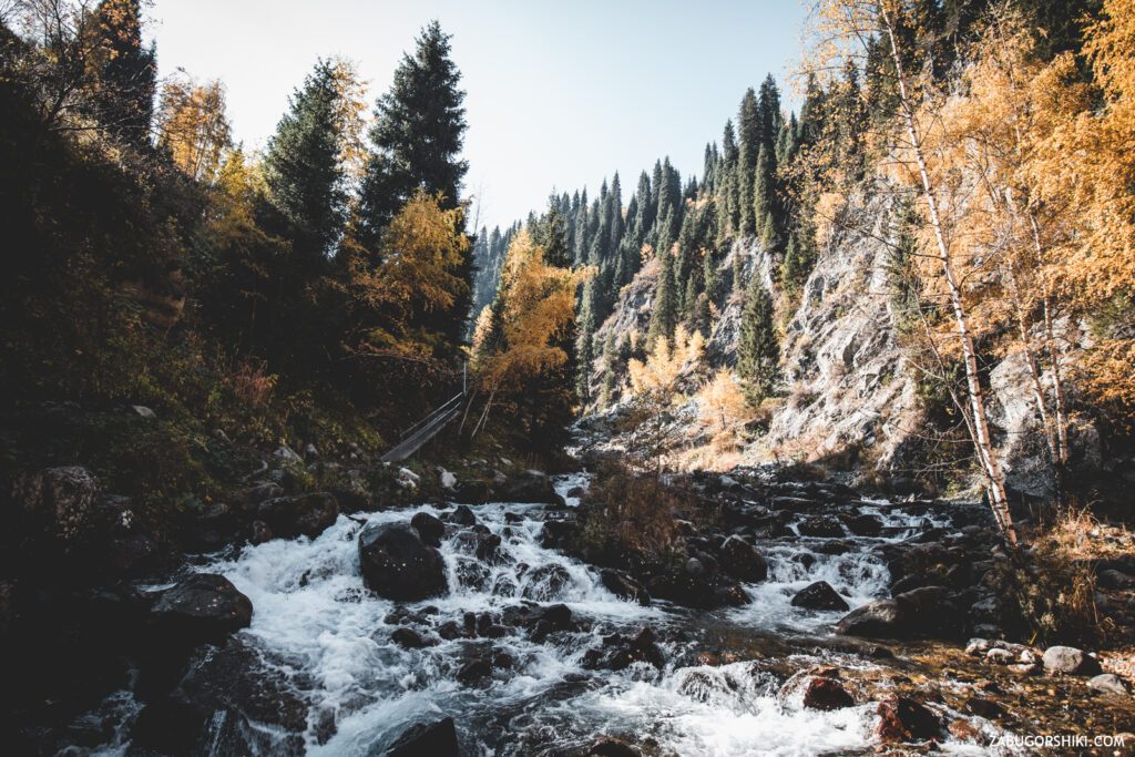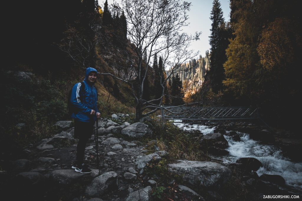 От поляны до моста идти минут 15 по хорошо протоптанной и очевидной тропе. На этом предложении наша адекватность «покинула чат» и свернули не туда. Вышли через мощнейшие кушары и заросли к бурлящей реке и вдоль нее минут 40 добирались до нужного места))))
