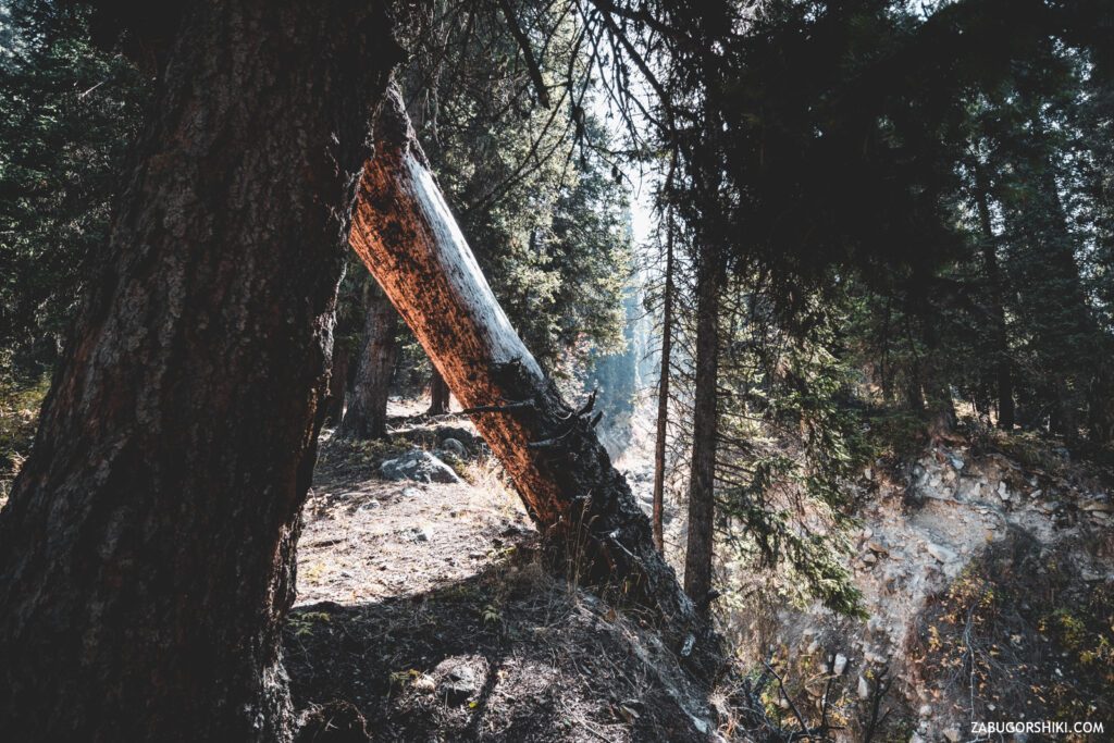 - Сразу за ручейком, по скалистым камням, меж могучих елей выйти на лесную тропку. Сначала идем по мягкой подстилке в хвойном лесу, затем попадаем в сказочную березовую рощу, а уж потом выходим на заветную тропу.